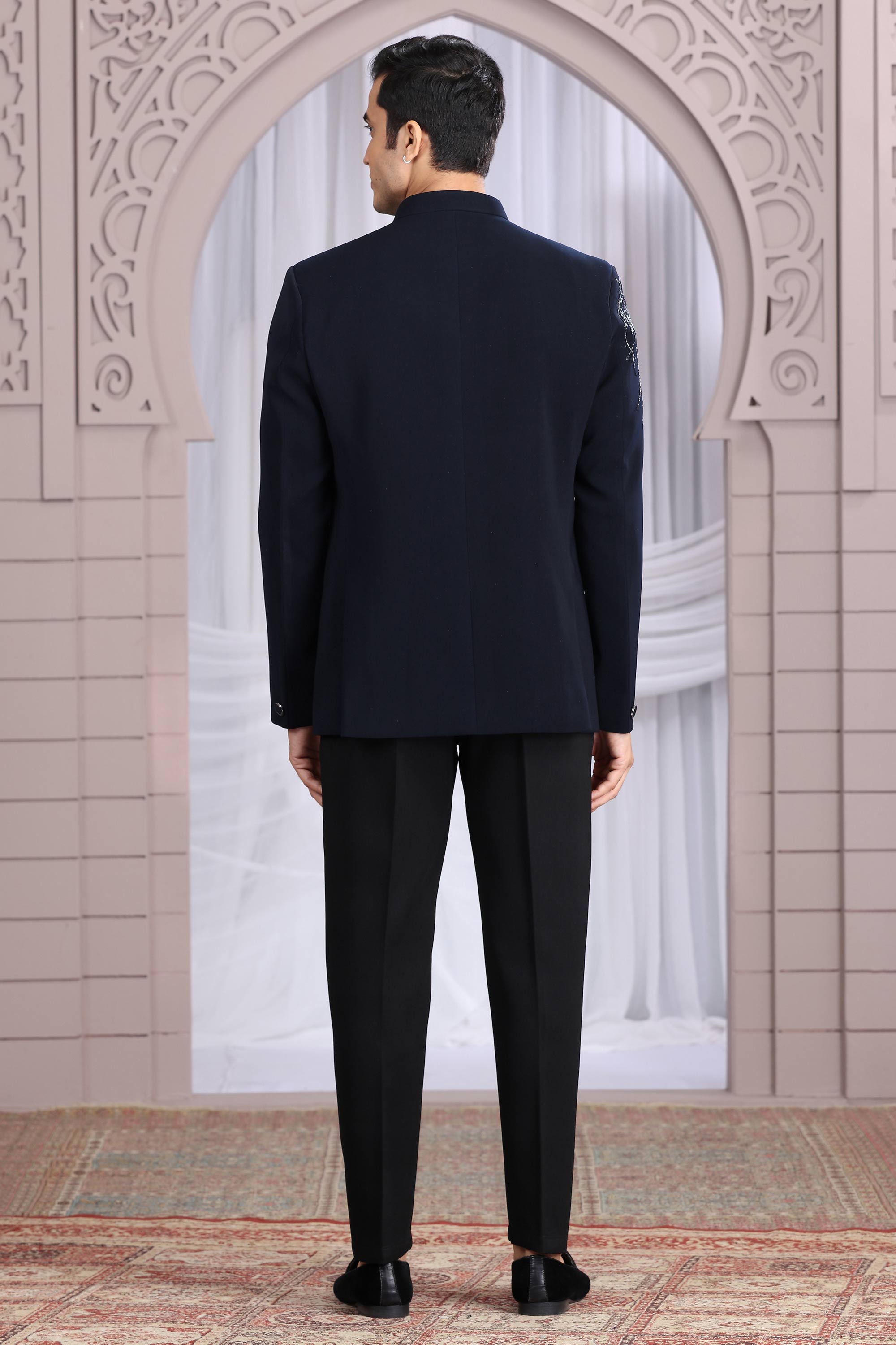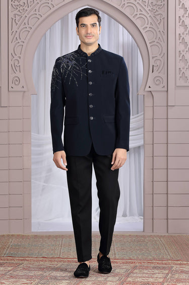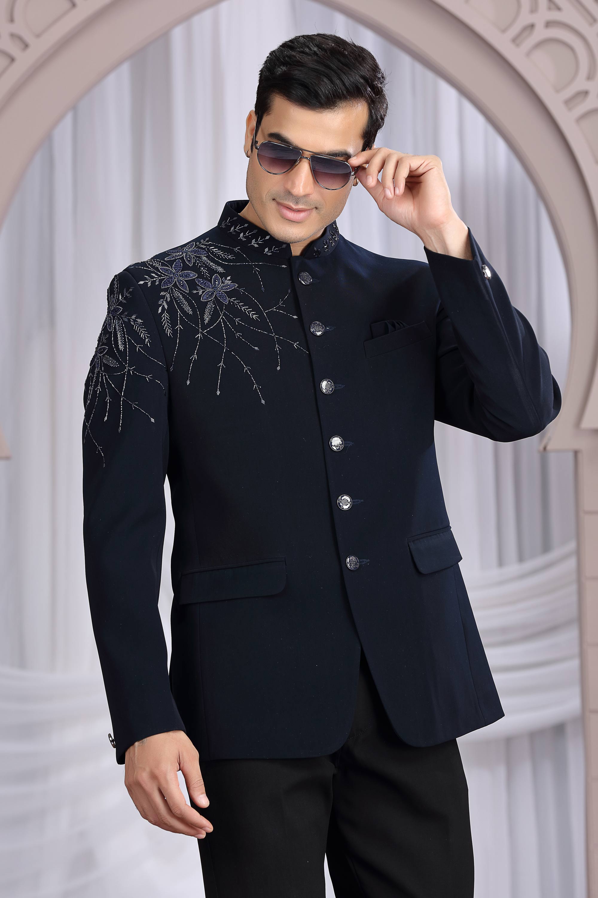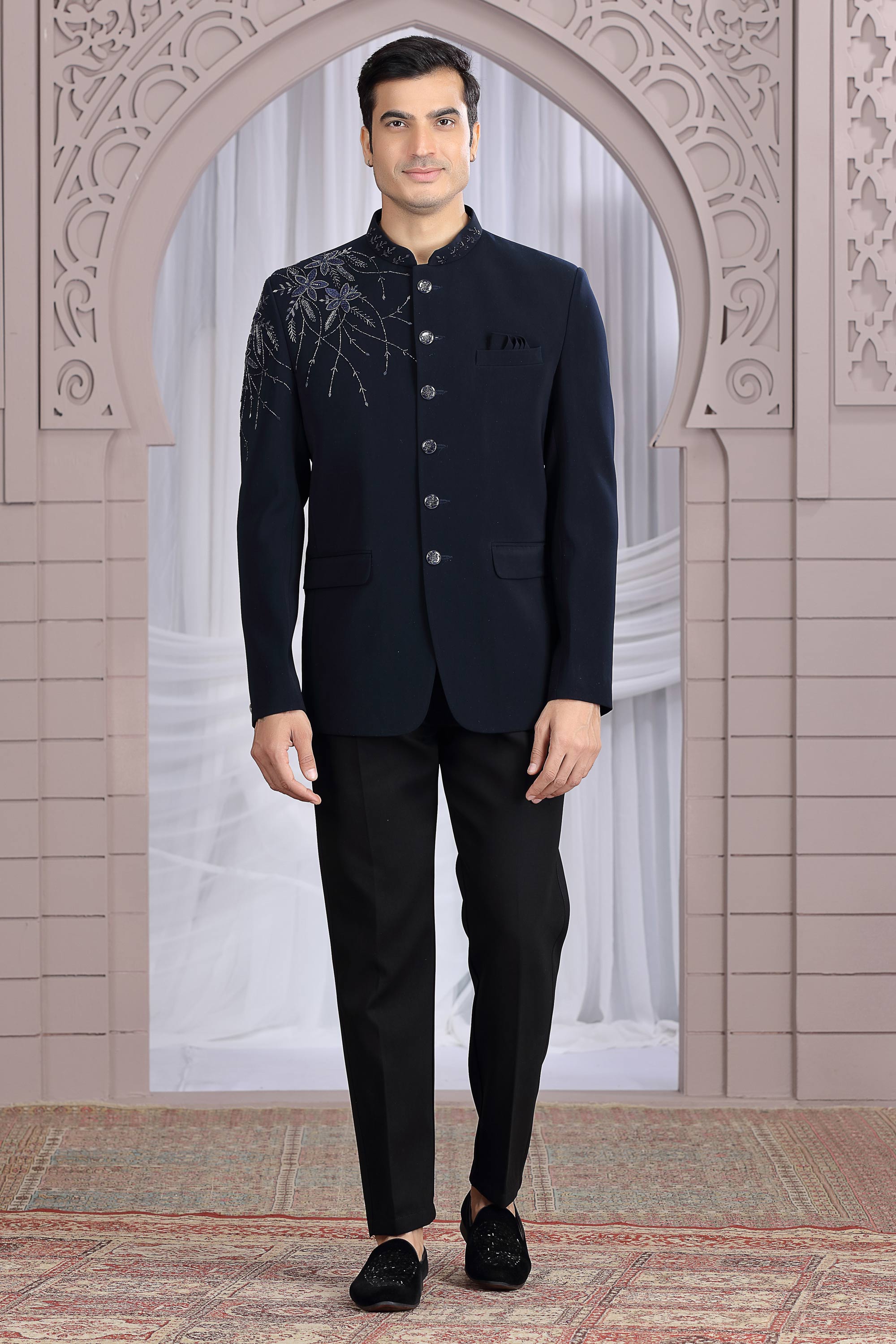 Navy Blue Fancy Fabric Wedding Wear Trendy Readymade Indo Western Jodhpuri Suit For Men