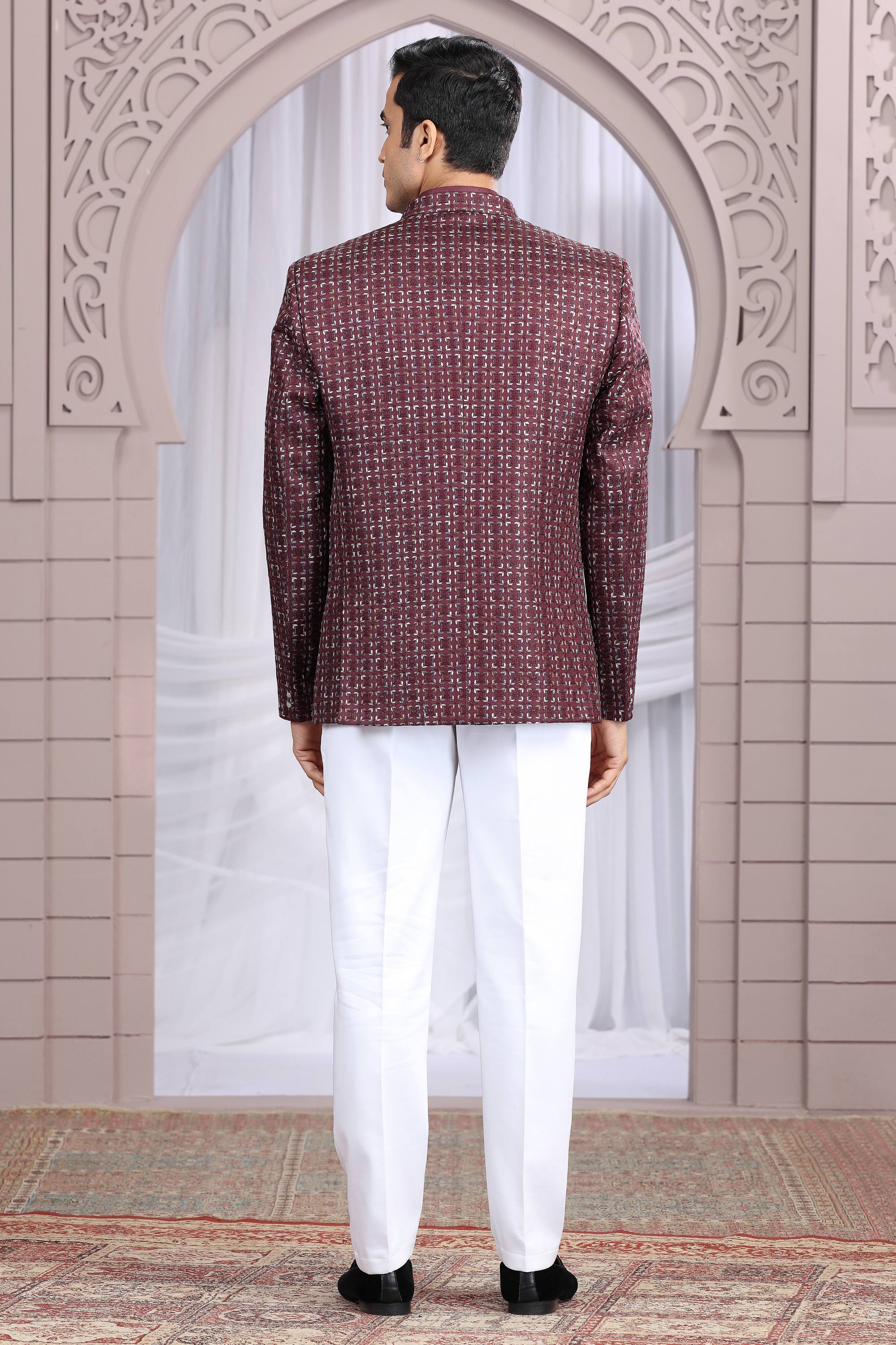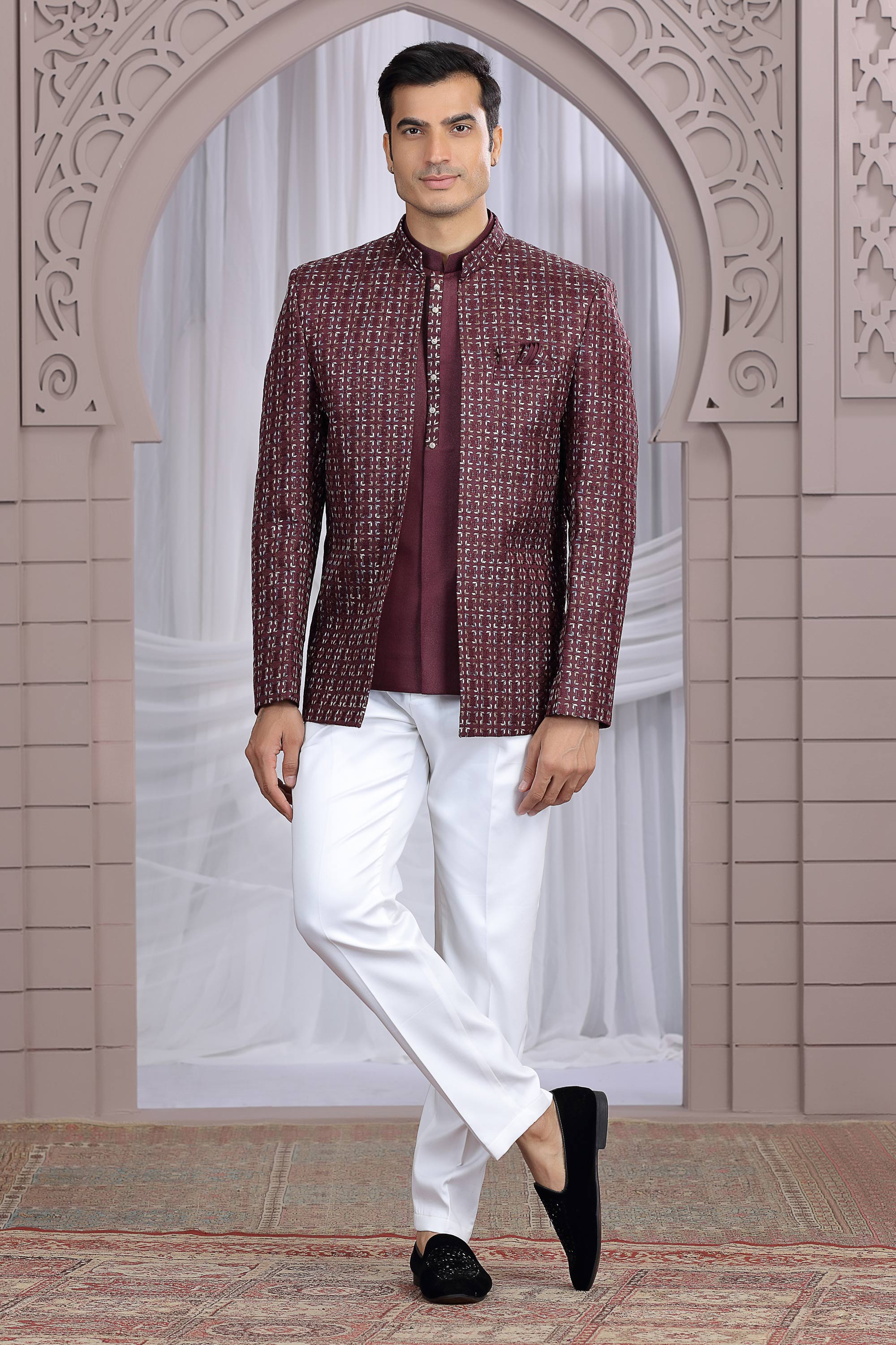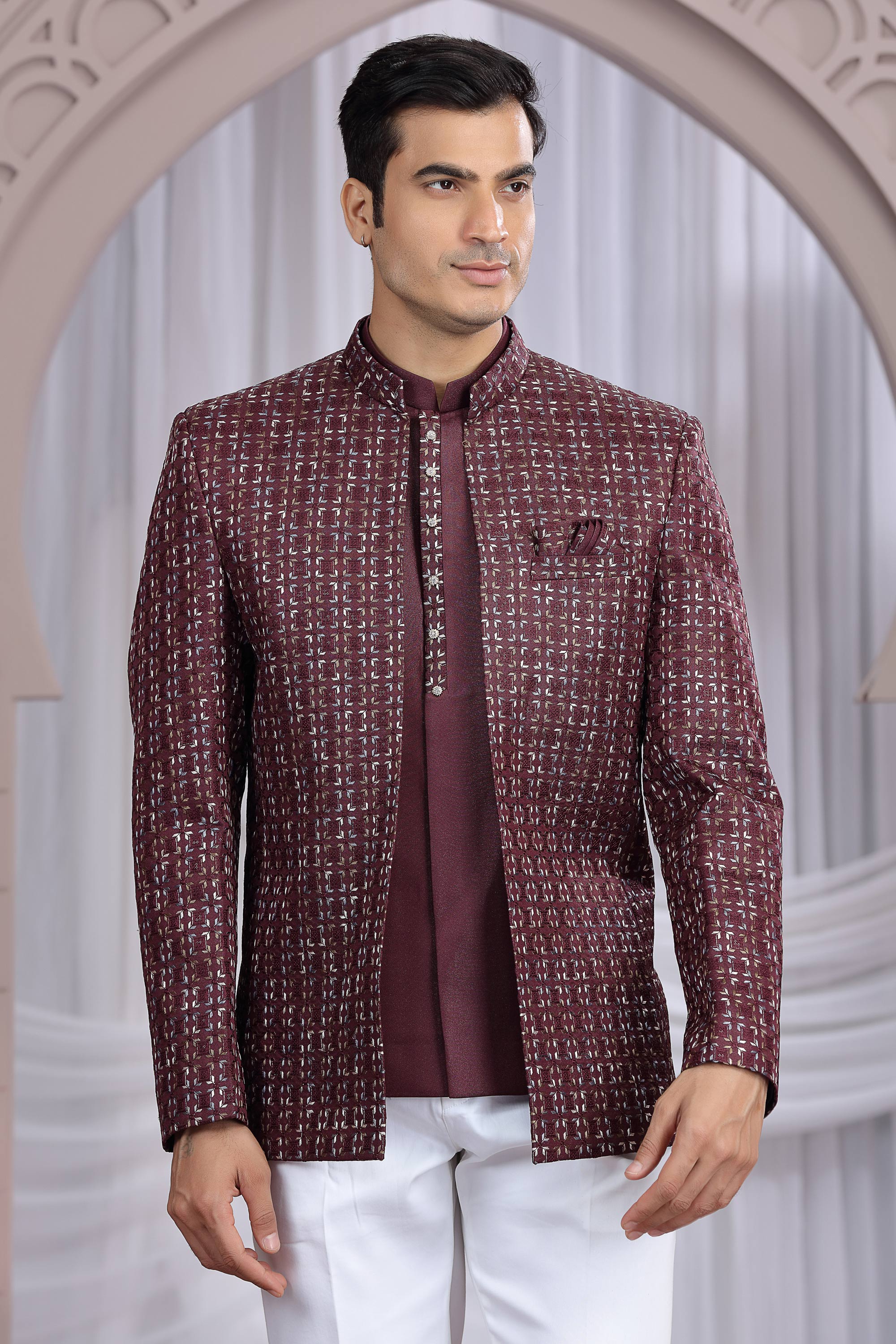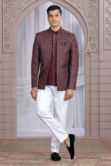 Wine Art Silk Graceful Readymade Men Indo Western Jodhpuri Suit