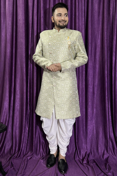 Pretty Jacquard Fabric Reception Wear Readymade Men Peshawari Style Indo Western In Olive Color