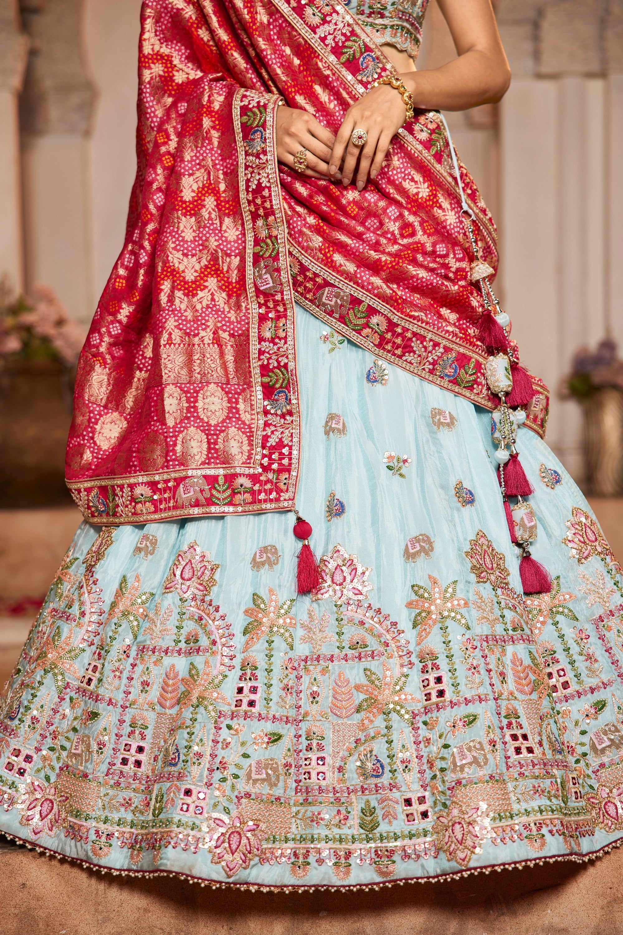 Sequins Embroidered Blue Bridal Lehenga In Tissue With Designer Choli