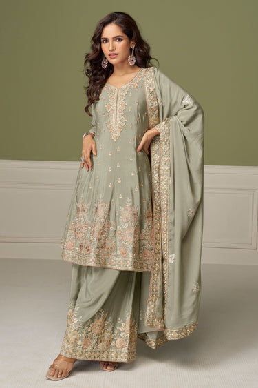 Make a statement with this exquisite Chinon embroidered readymade Sharara-style salwar kameez. This elegant outfit blends tradition and modernity effortlessly, featuring delicate embroidery on soft, high-quality Chinon fabric that feels comfortable on your skin. The ready-to-wear design ensures convenience, while the flowing sharara pants add a fashionable flair perfect for weddings, festivals, and special occasions. Designed for both comfort and sophistication, it is suitable for women looking to showcase their ethnic charm without compromising on ease of wear. Style it with your favorite accessories to complete your festive or formal look.
