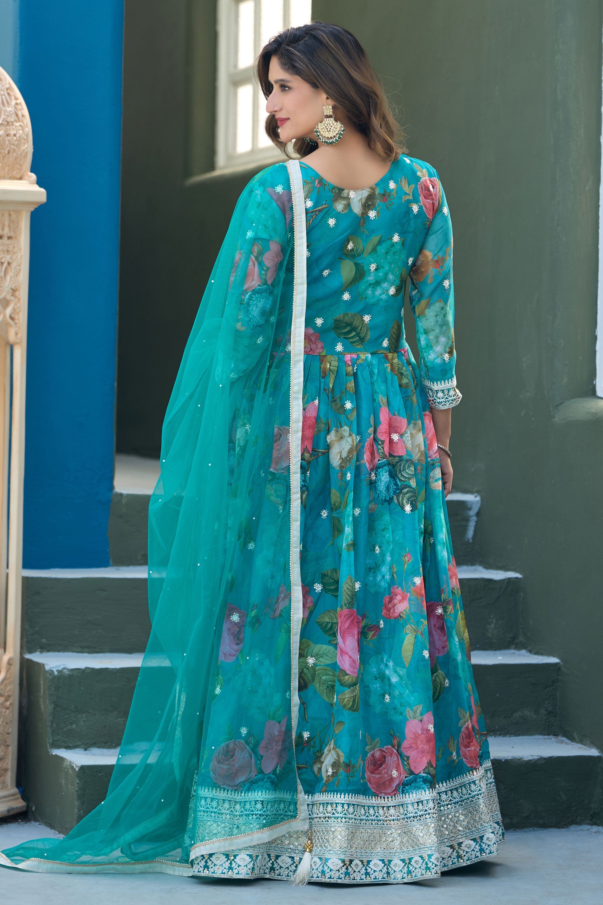 Step into grace and elegance with this Cyan Printed Art Silk Anarkali Style Gown, perfectly designed for special occasions. This outfit showcases vibrant prints on smooth art silk fabric, providing comfort and sophistication all day long. The timeless Anarkali design enhances your silhouette with flowing flair, making it ideal for festive celebrations, weddings, or cultural gatherings. Complemented by a matching dupatta, it adds a touch of classic charm. Its lightweight fabric ensures effortless movement while exuding style and tradition in every step. Elevate your wardrobe with this versatile and chic ensemble!