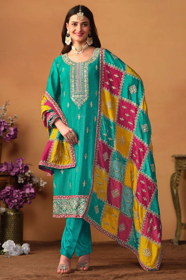 Sea Green Color Glittering Chinon Silk Fabric Designer Suit With Multi Color Dupatta
