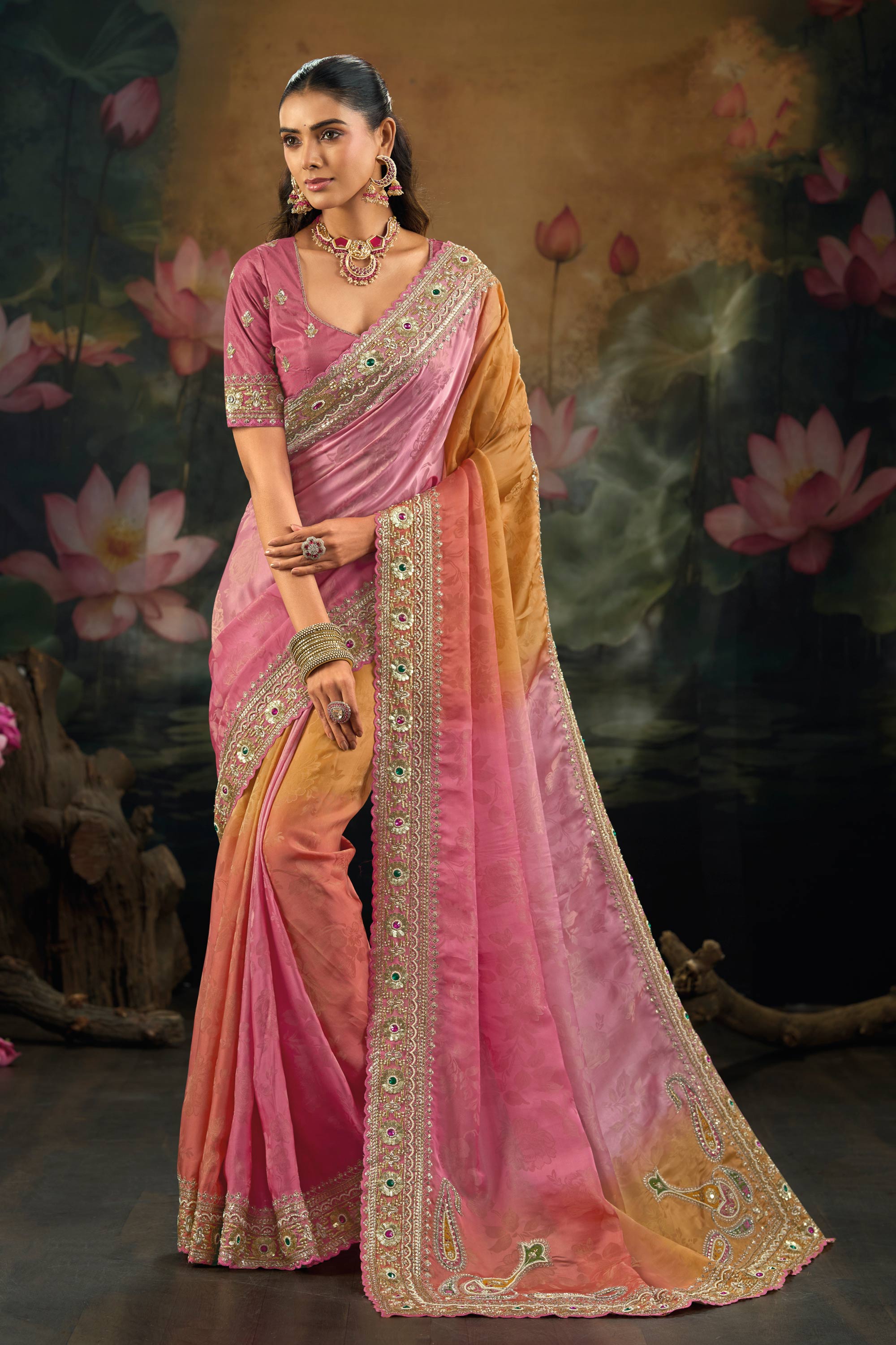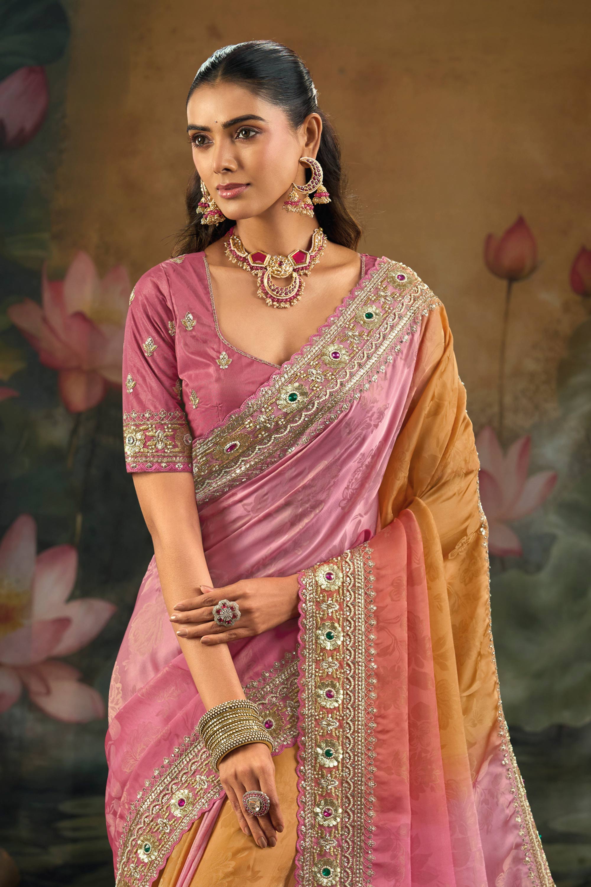Silk Fabric Embroidered Pink Saree For Sangeet Wear