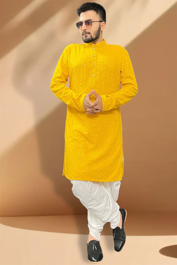 Adorning Yellow Color Rayon Fabric Peshawari Style Indo Western Set