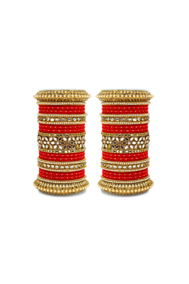 Alloy Material Mesmeric Bridal Bangle Set With Flower Mirror Kada In Red Color
