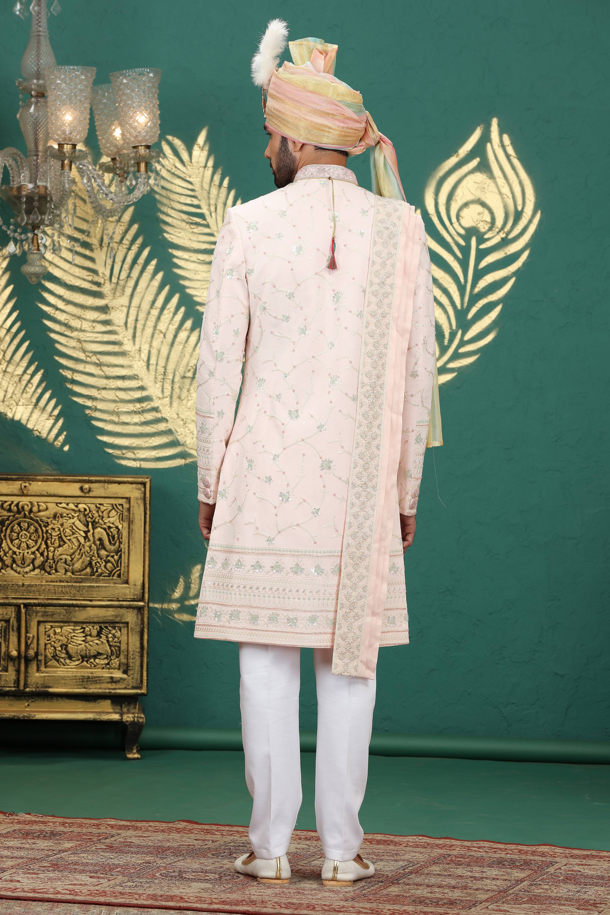 Alluring Peach Embroidered Art Silk Groom Sherwani