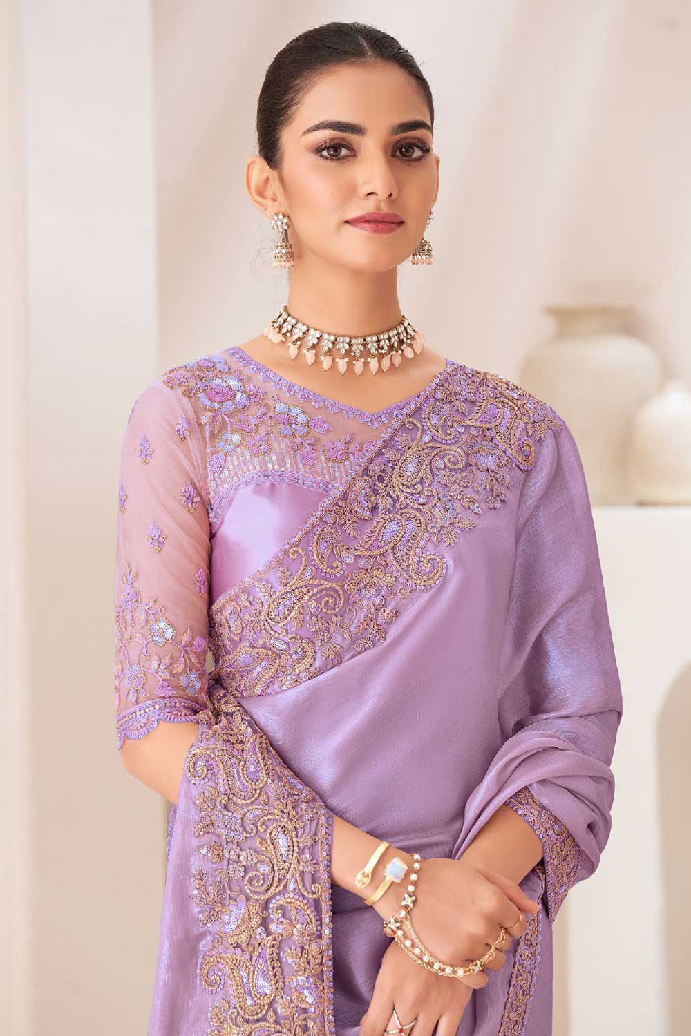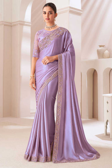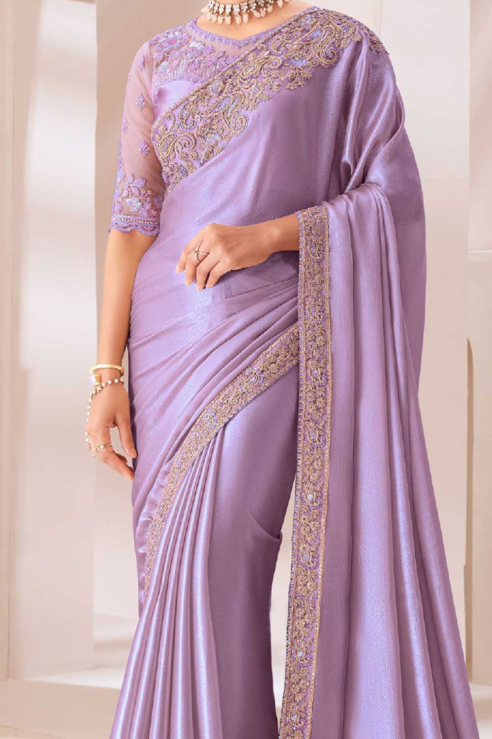 Amazing Border Work On Lavender Color Chiffon Fabric Saree