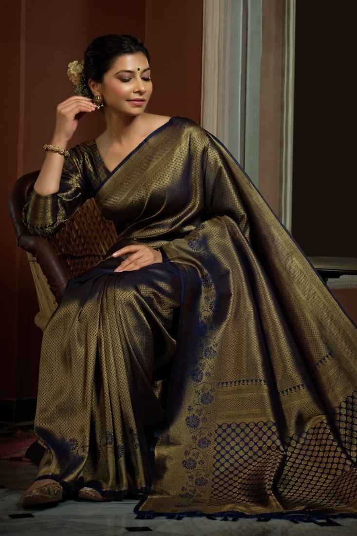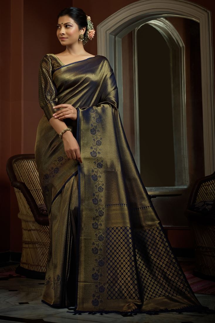 Amazing Navy Blue Color Kanjivaram Silk Weaving Work Two Tone Saree