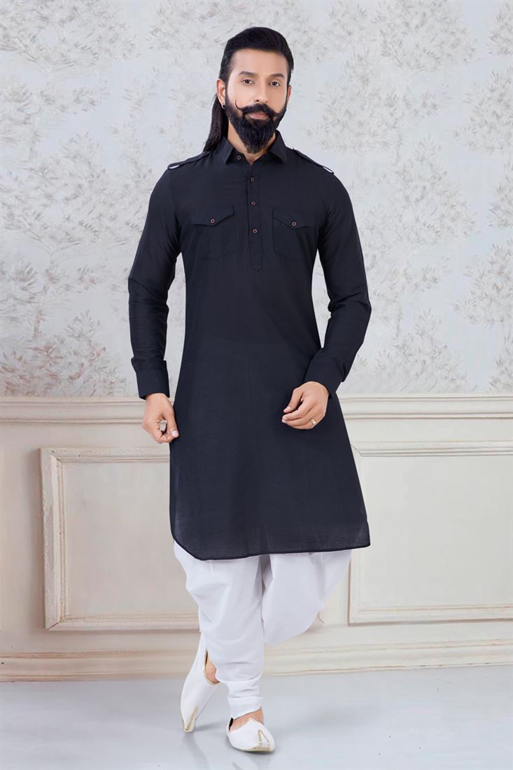 Appealing Black Color Cotton Fabric Festive Wear Stylish Readymade Dhoti Style Kurta Pyjama For Men
