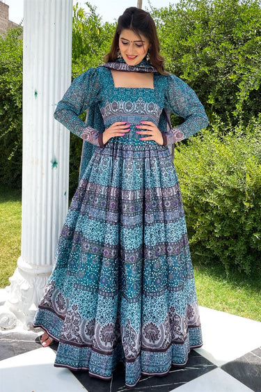 Appealing Cyan Color Chanderi Fabric Festive Wear Embroidered Readymade Anarkali Salwar Suit