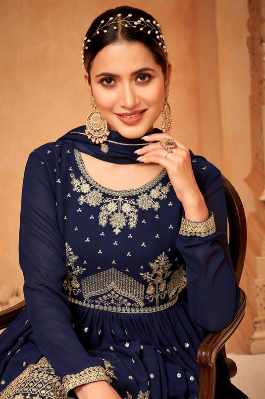 Appealing Georgette Fabric Sangeet Wear Sharara Suit In Navy Blue Color