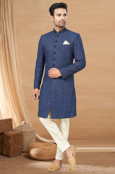 Appealing Navy Blue Color Fancy Fabric Readymade Indo Western For Men