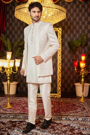 Art Silk Cream Coloe Wedding Wear Lovely 3 Piece Indo Western For Men