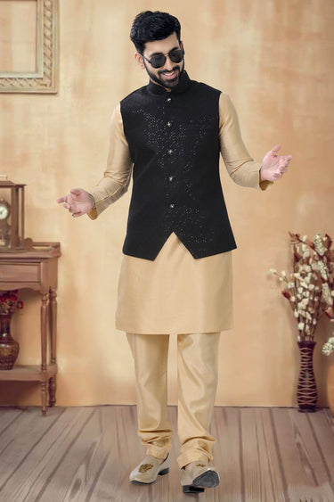 Art Silk Cream Color Wedding Wear Readymade Designer Men Kurta Pyjama With Modi Jacket