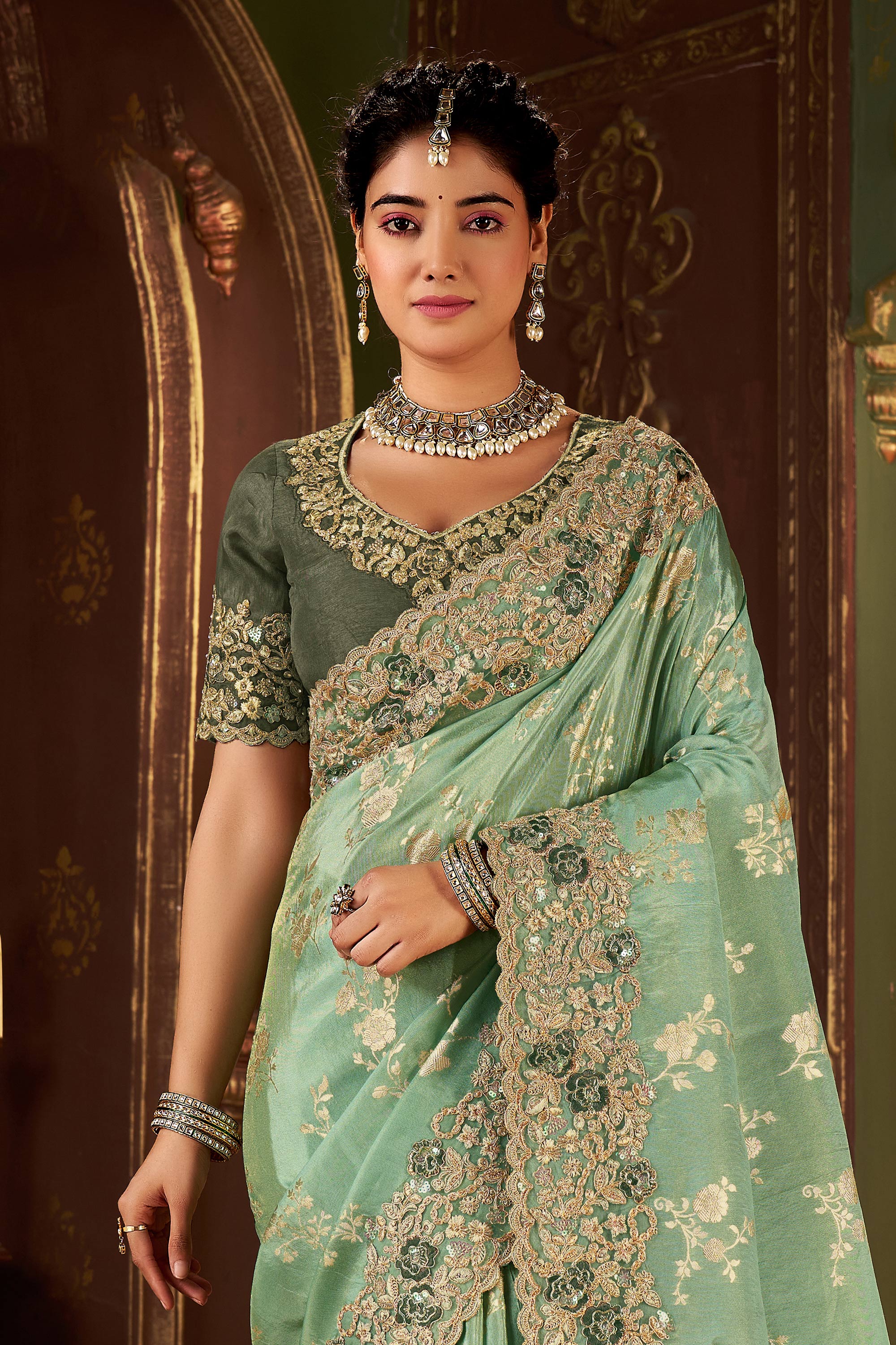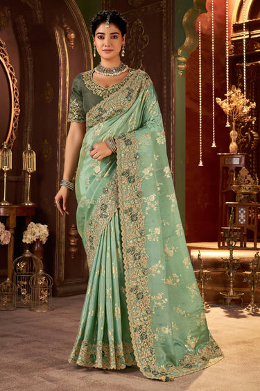 Art Silk Embroidered Border Work Sea Green Function Wear Saree