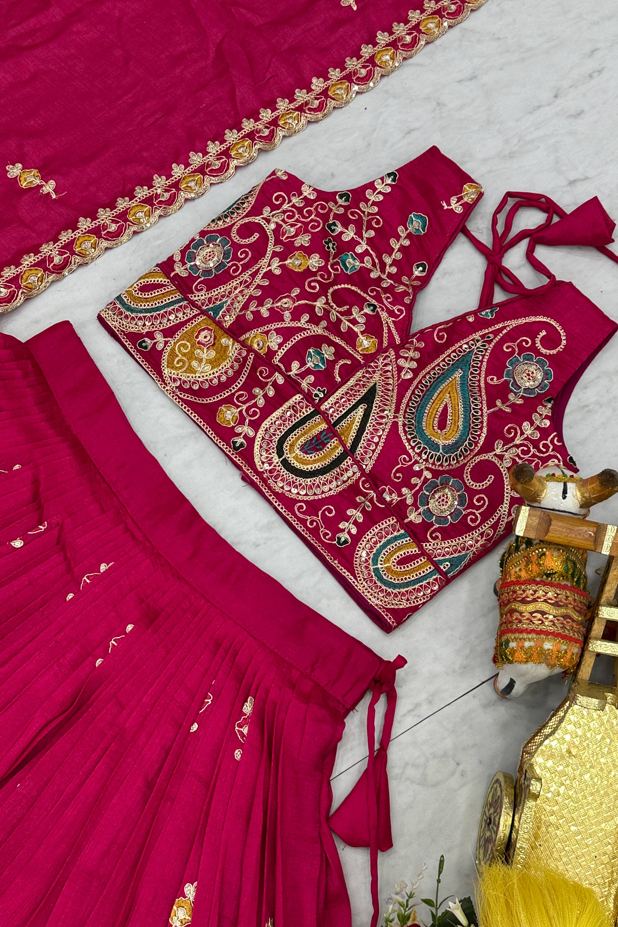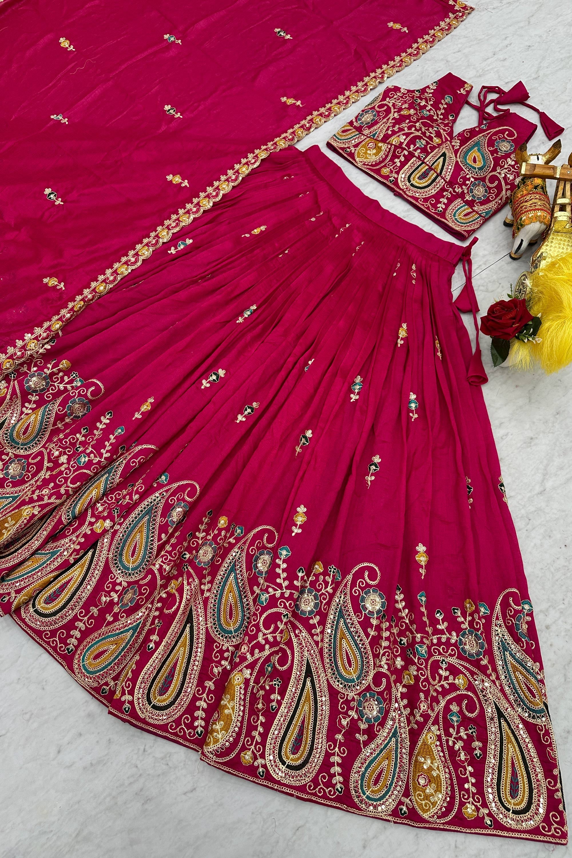 This elegant Readymade Designer Lehenga Choli set is perfect for festive and special celebrations. Crafted from art silk fabric, the lehenga, blouse, and matching art silk dupatta offer a rich and graceful look. Enhanced with beautiful embroidery work and available in a rich color, this outfit is ideal for Sangeet ceremonies, functions, and festivals. Note: Due to digital photography, slight color variations may occur.