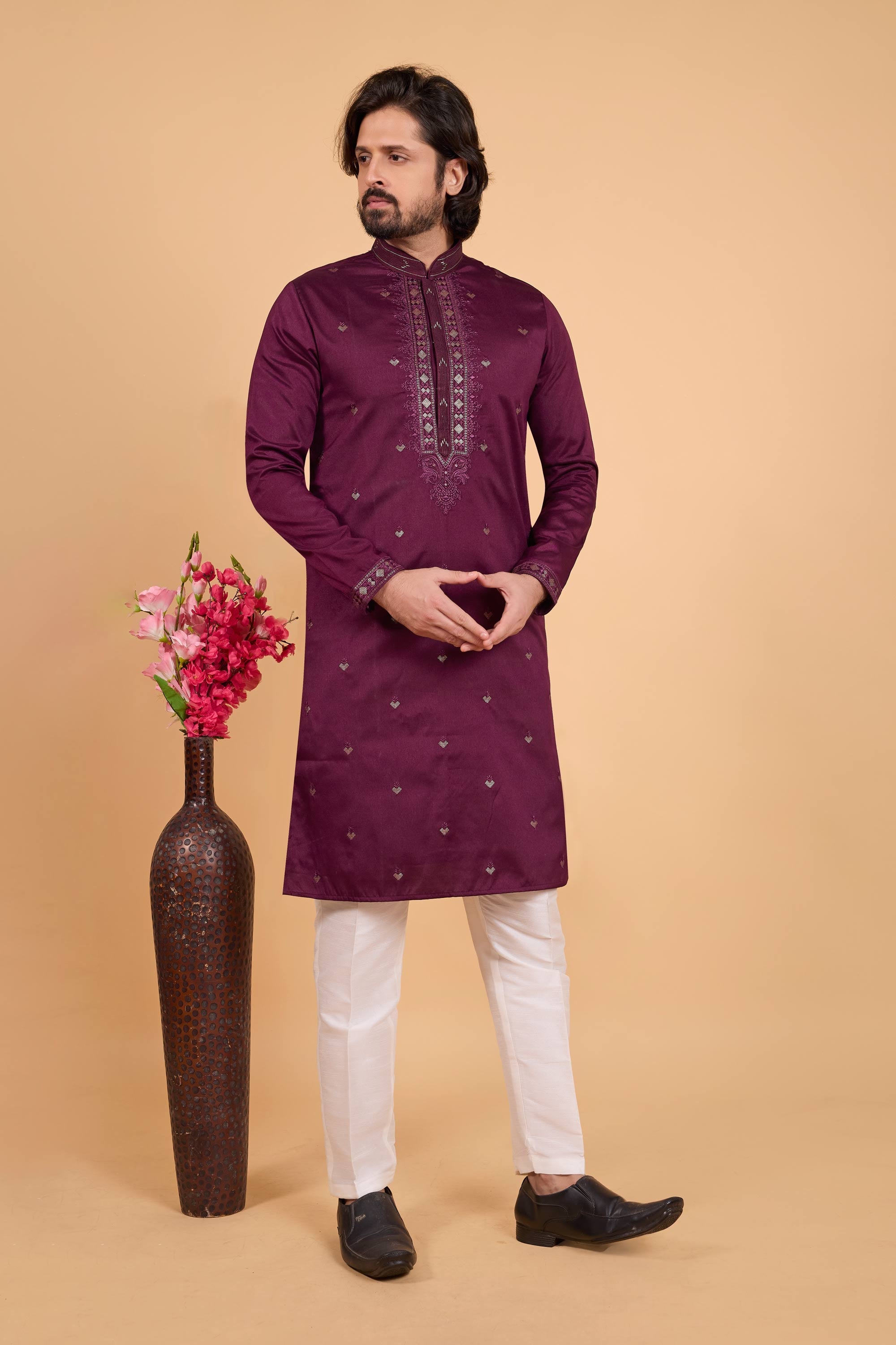 Art Silk Embroidered Wine Festive Wear Kurta Pyjama For Men
