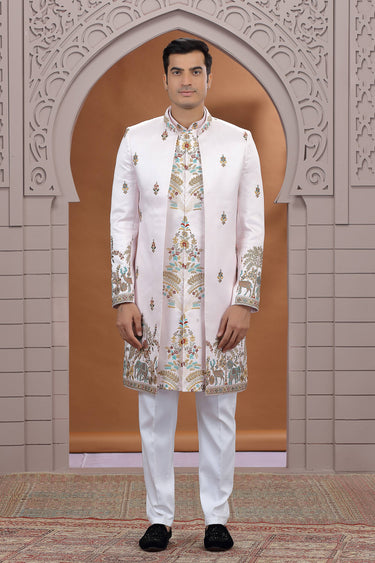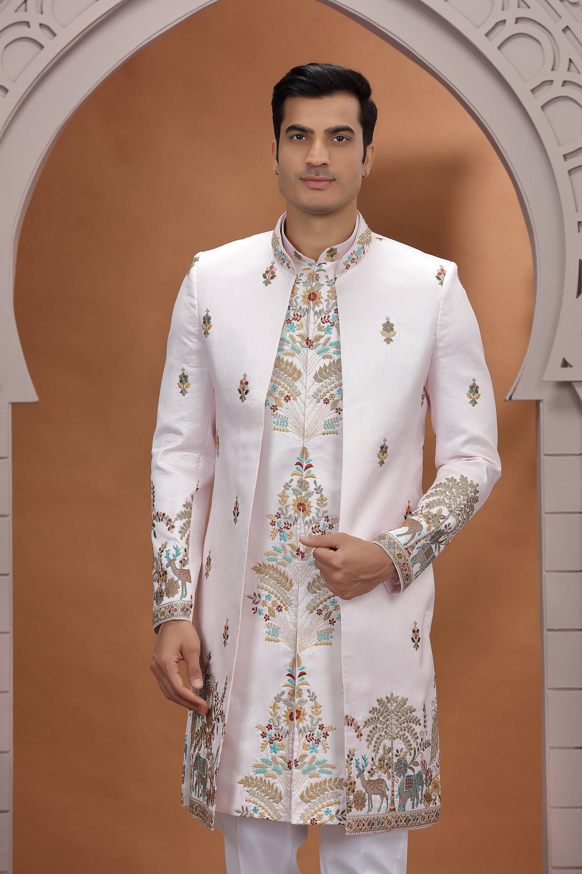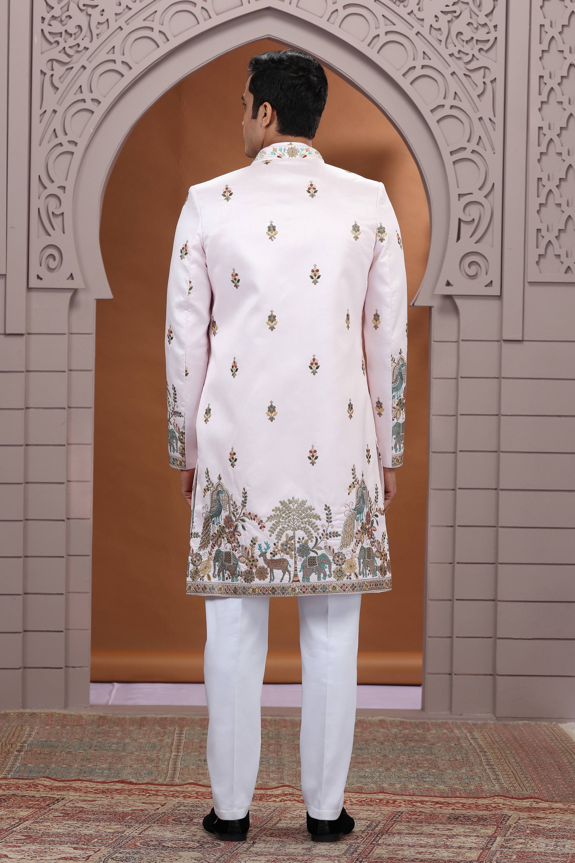 Art Silk Embroidery Pink Readymade 3 Piece Indo Western For Men