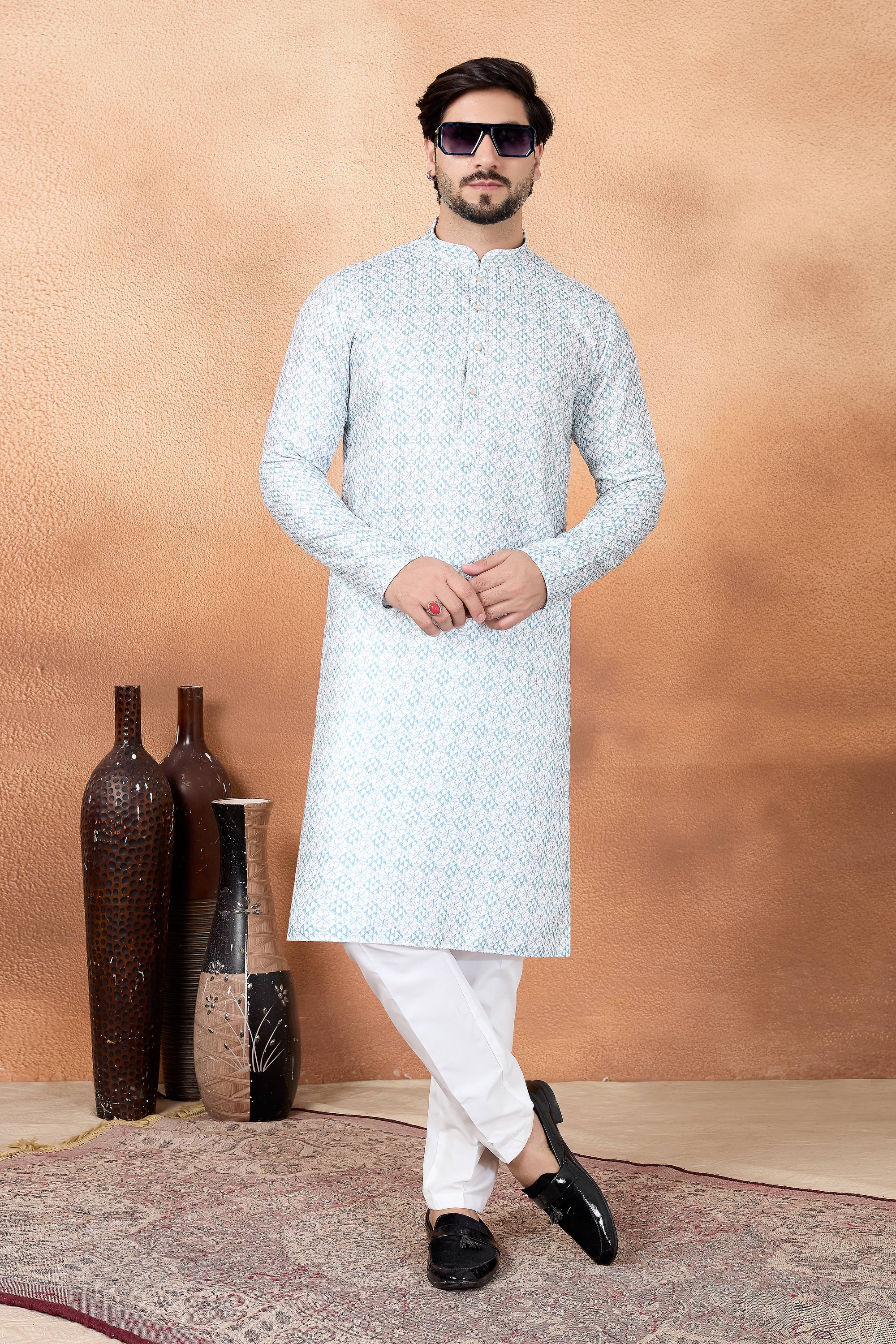 Art Silk Fabric Cyan Function Wear Readymade Kurta Pyjama For Men