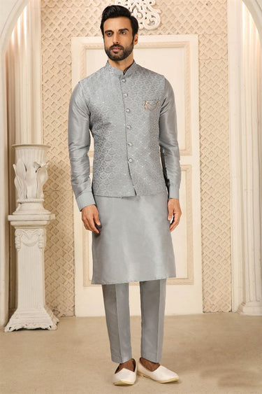 Art Silk Fabric Grey Color Ethnic Style Kurta Pyjama Jacket Set