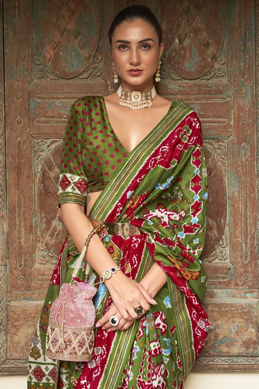 Art Silk Fabric Mehendi Green Color Excellent Patola Printed Saree