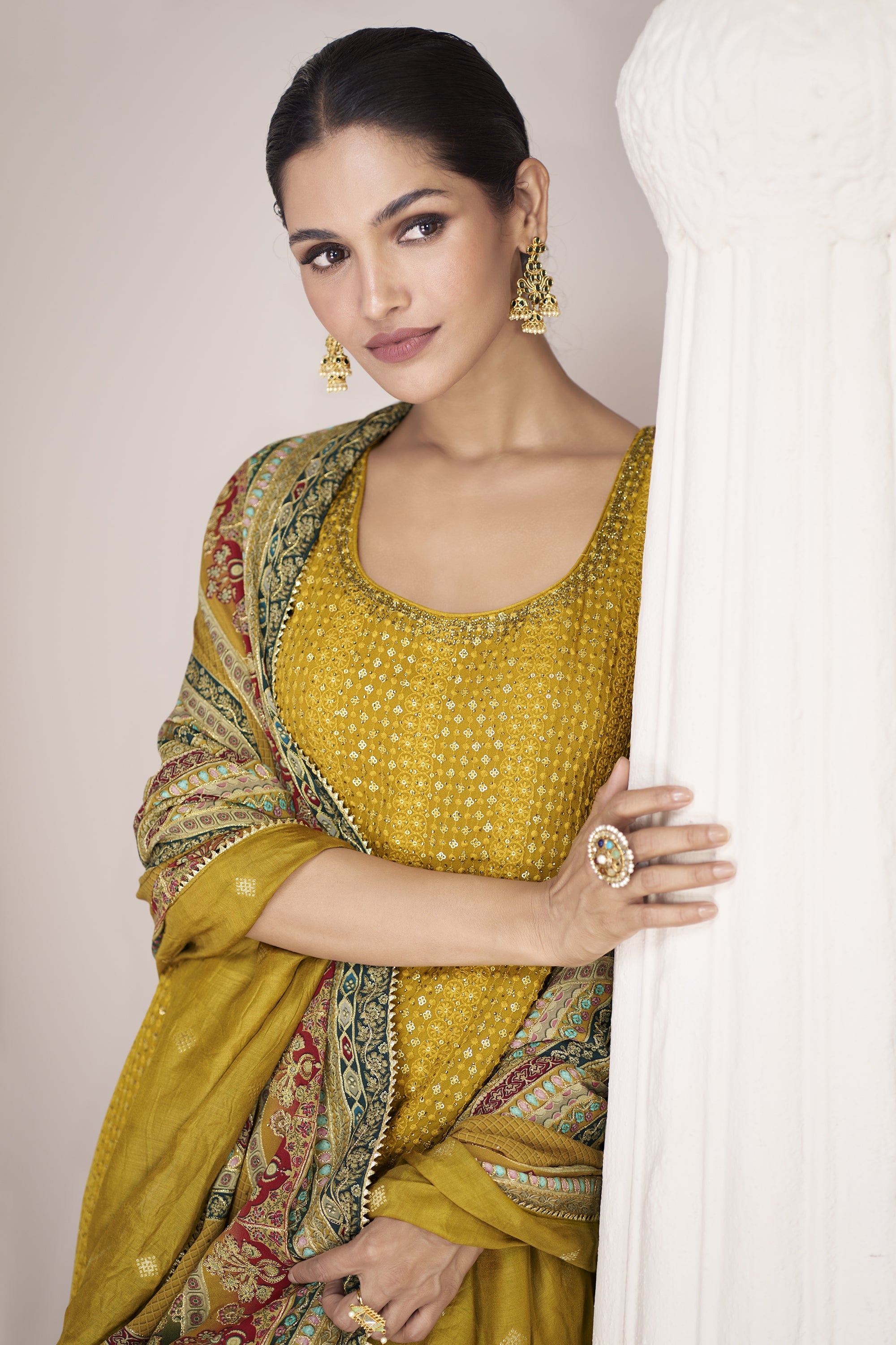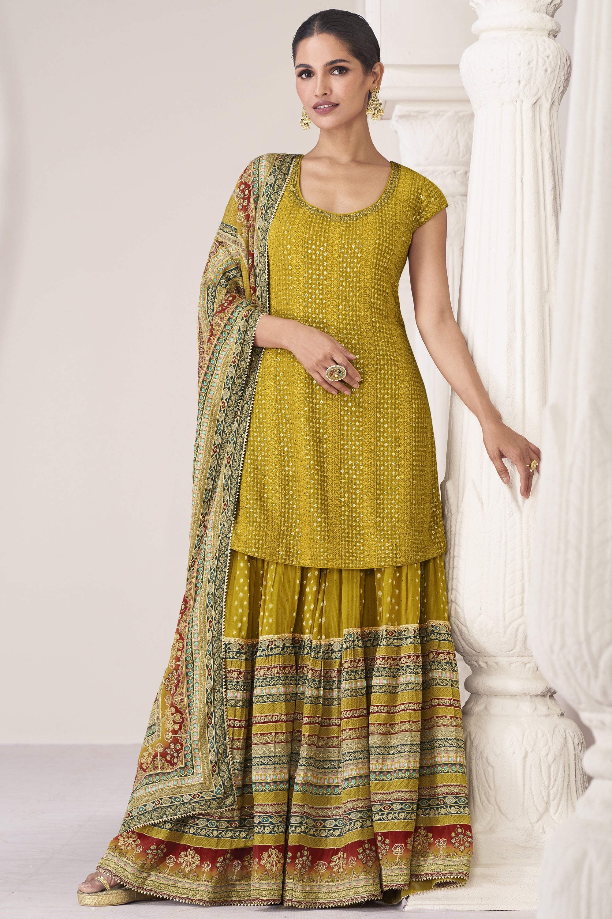 Art Silk Fabric Mustard Color Festive Wear Embroidered Readymade Sharara Style Salwar Kameez