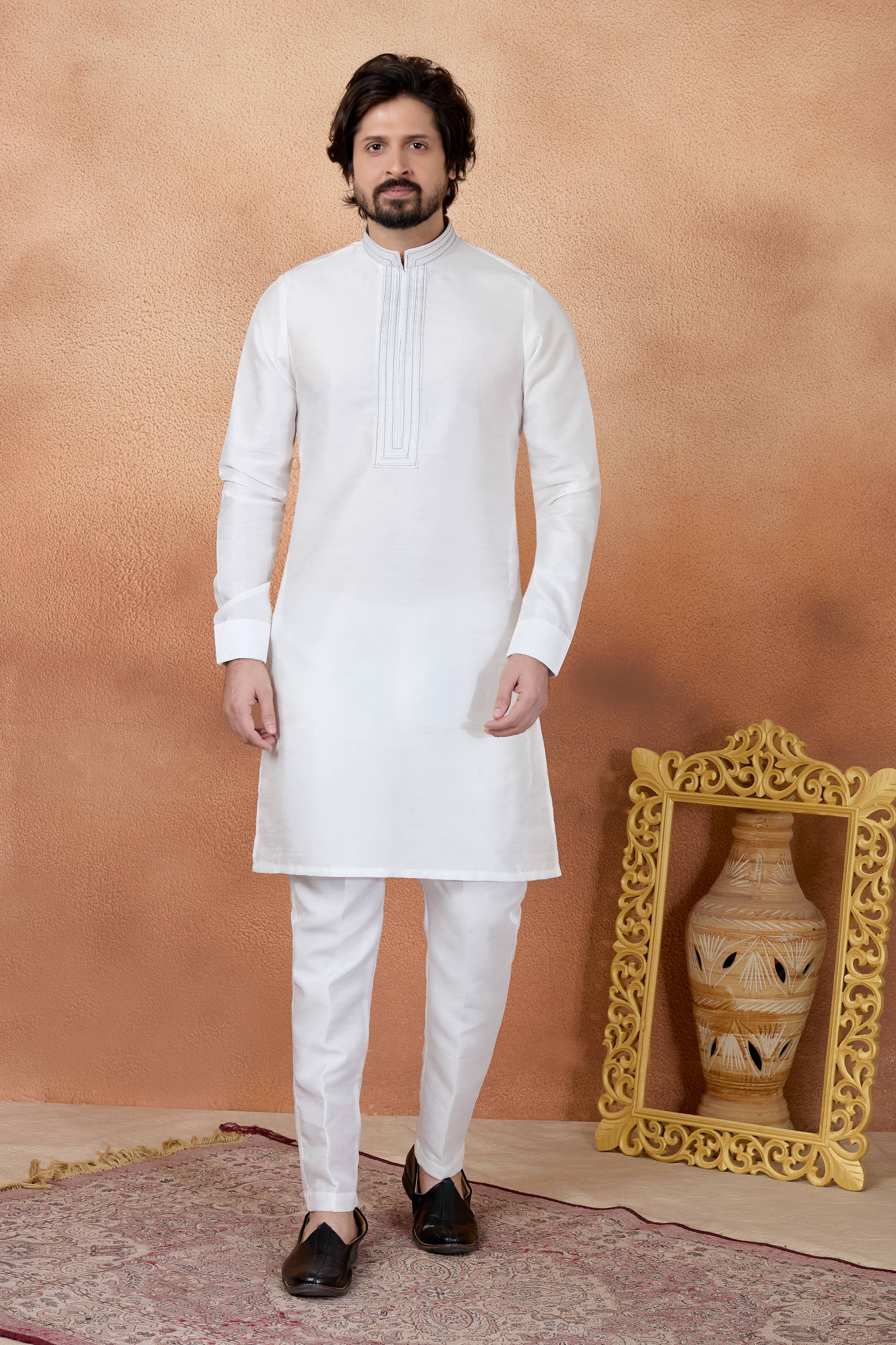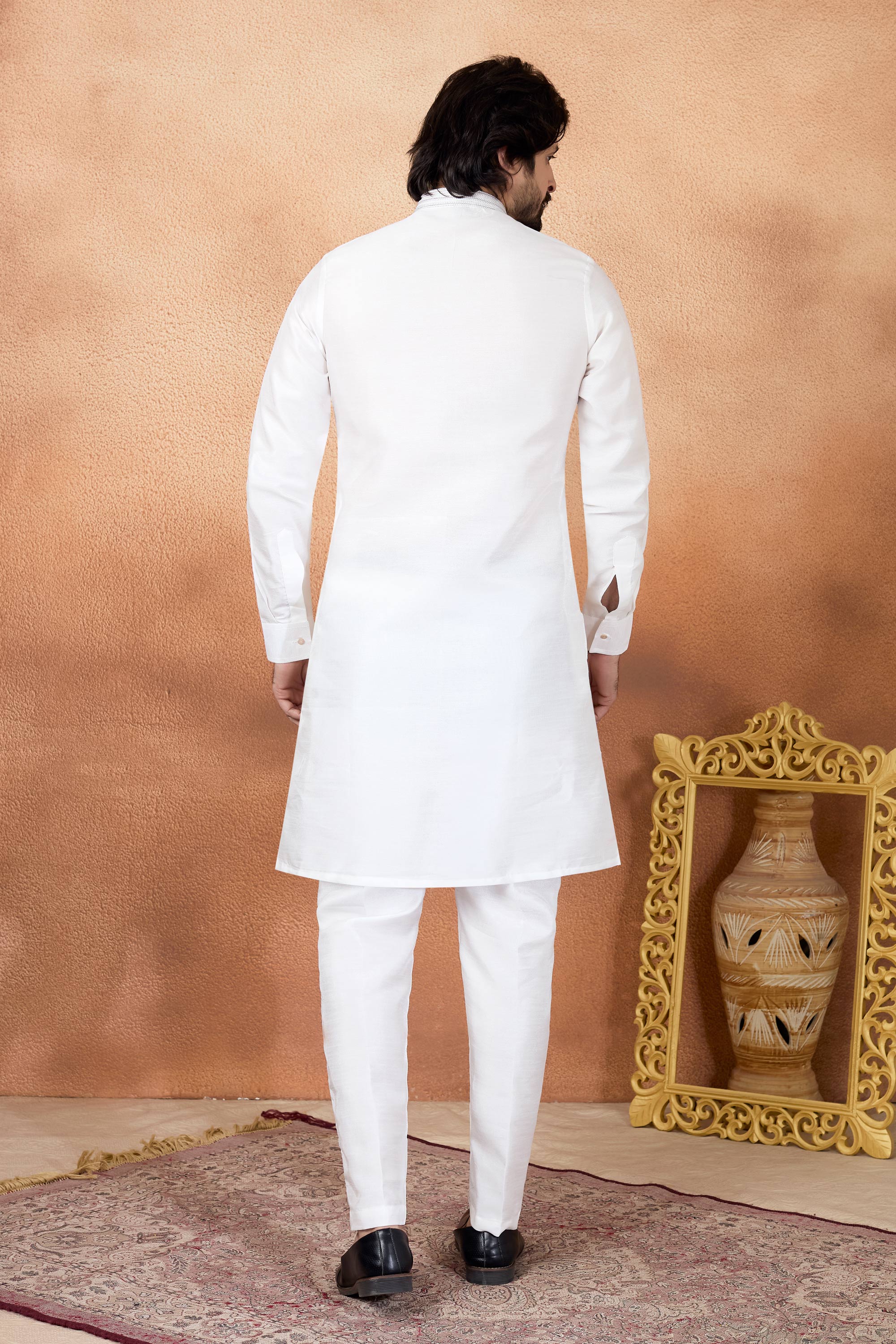 Step into timeless tradition with this Mens Kurta and Aligadhi Pant Ensemble, designed for graceful festive appearances. The art silk straight kurta offers a sleek silhouette, paired beautifully with an art Banarasi silk Aligadhi pant, creating a balanced blend of comfort and sophistication, while slight color variations may occur due to digital photography.