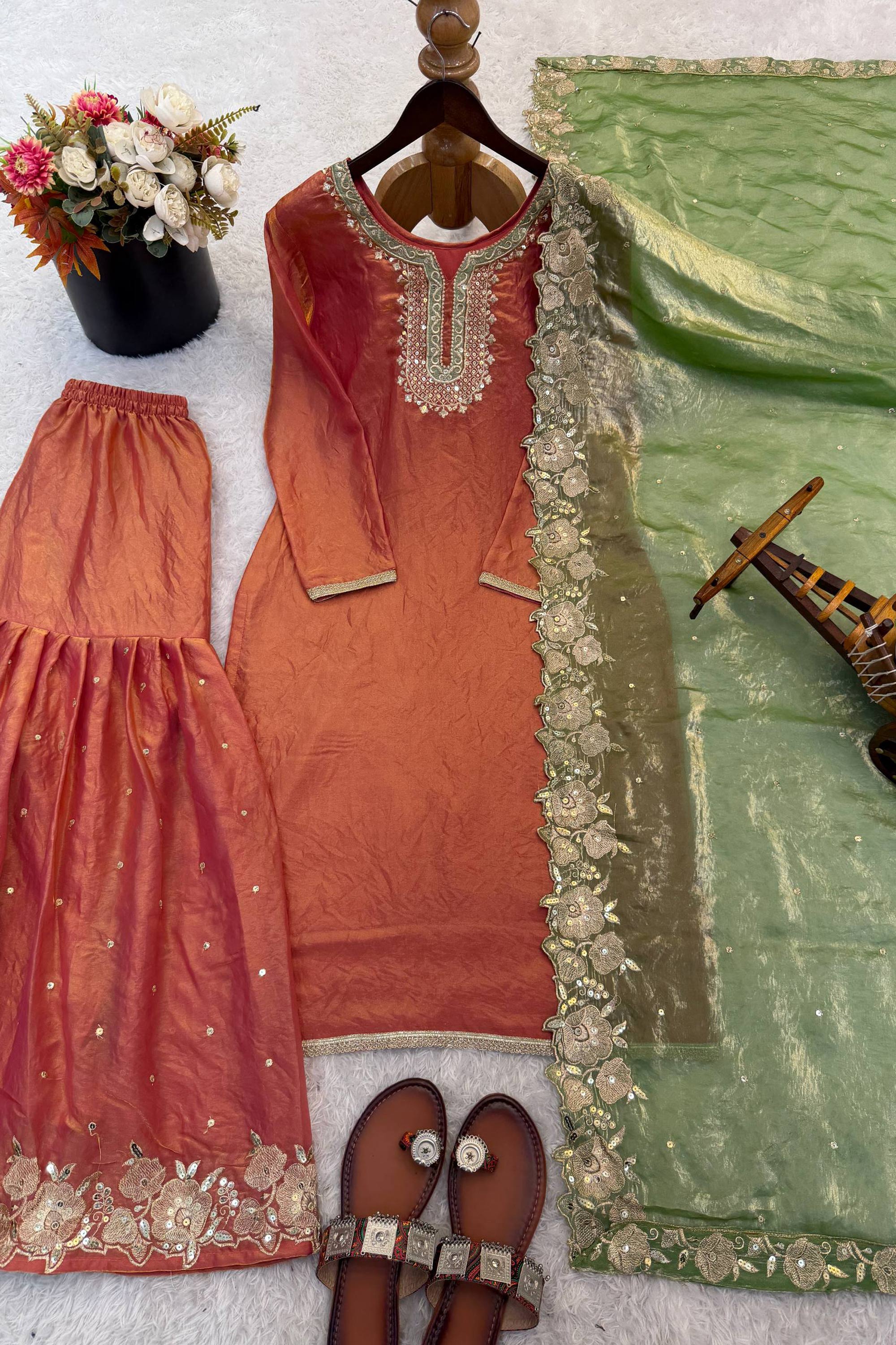 Art Silk Fabric Orange Festive Wear Readymade Palazzo Suit