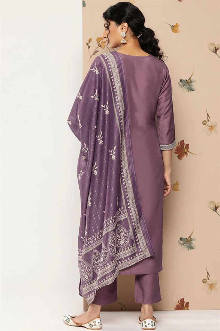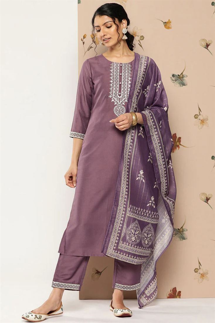 Art Silk Fabric Purple Color Patterned Top Bottom Dupatta Set With Embroidered Work