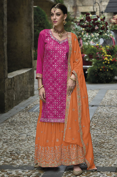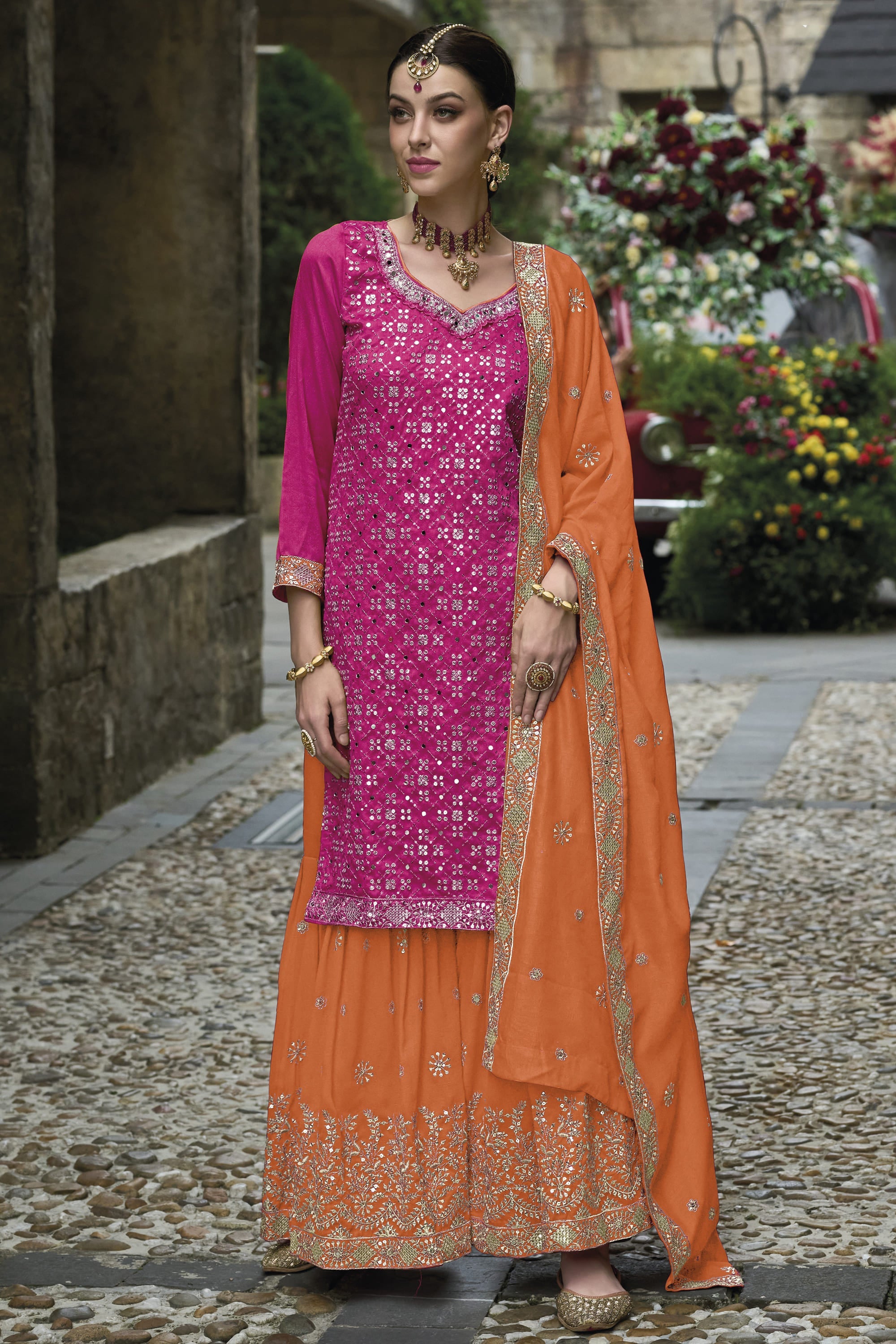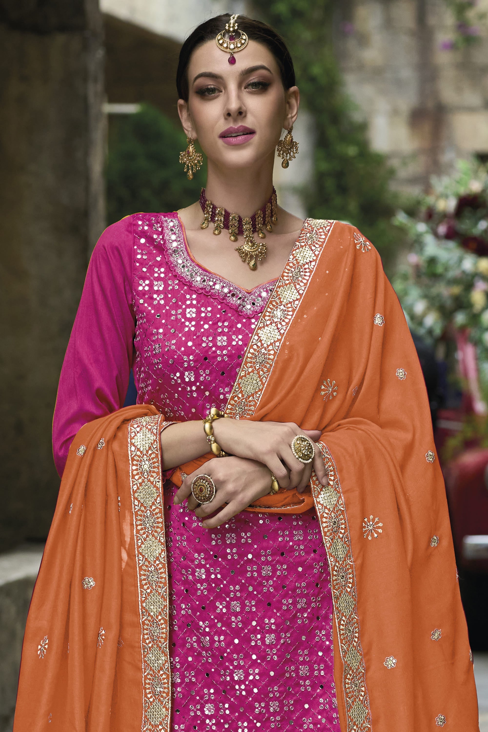 Art Silk Fabric Rani Color Festive Wear Embroidered Readymade Palazzo Salwar Kameez
