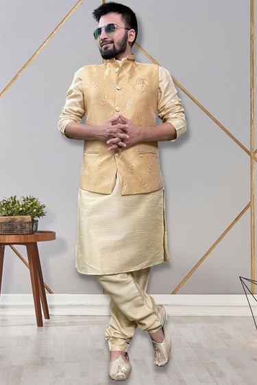 Art Silk Fabric Readymade Stunning Kurta Pyjama For Men With Cream Color 3 Pcs Jacket Set