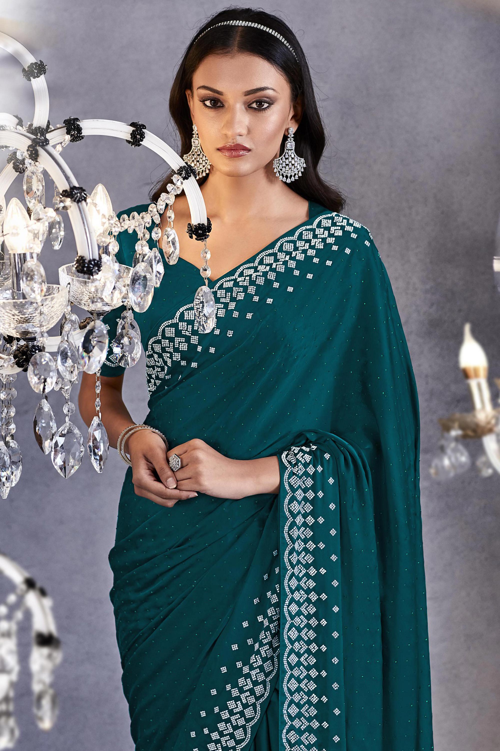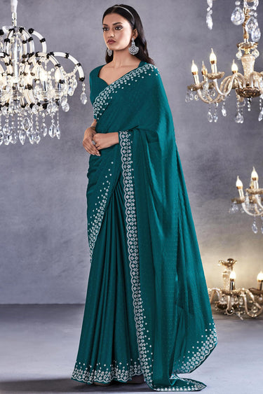 Art Silk Fabric Teal Color Zarkan Work Saree With Same Color Blouse