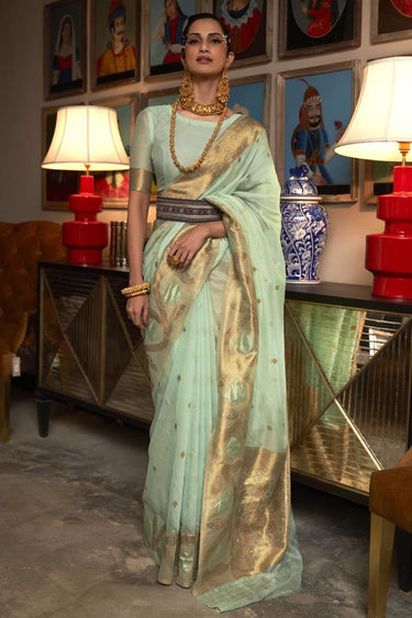 Art Silk Fabric Weaving Designs Luminous Saree In Sea Green Color
