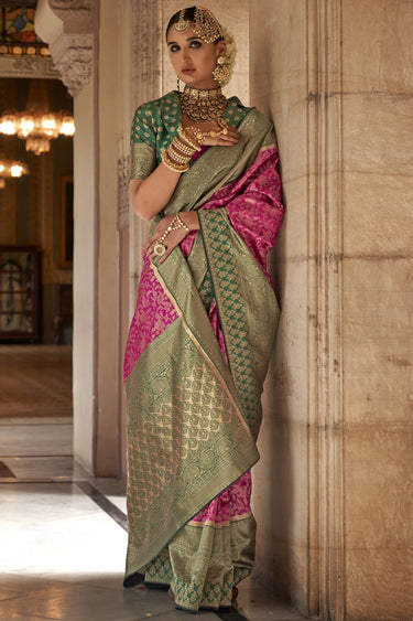 Art Silk Fabric Weaving Work Glamorous Rani Color Wedding Wear Traditional Look Saree With Contrast Blouse
