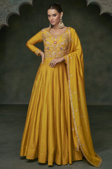 Art Silk Mustard Festive Wear Embroidered Readymade Long Anarkali Style Gown