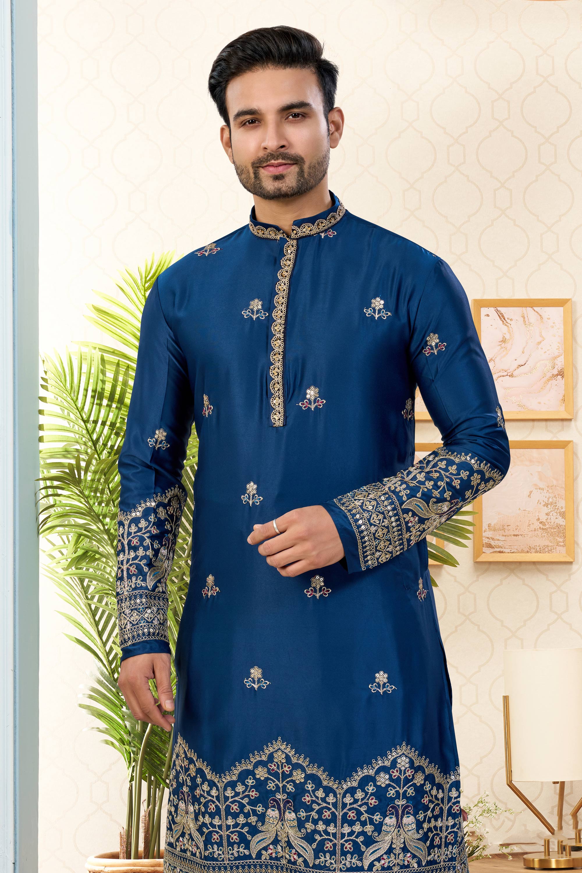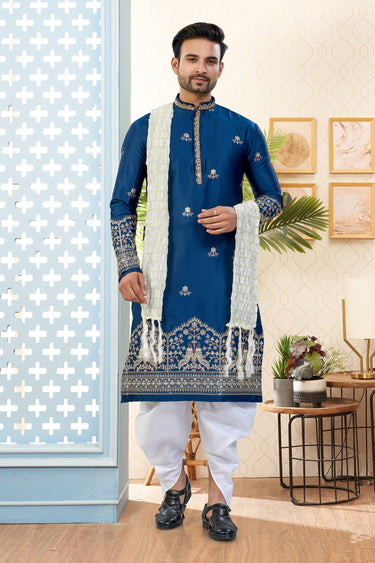 Art Silk Navy Blue Wedding Wear Readymade Kurta With Dhoti For Men