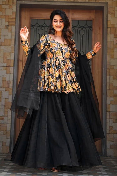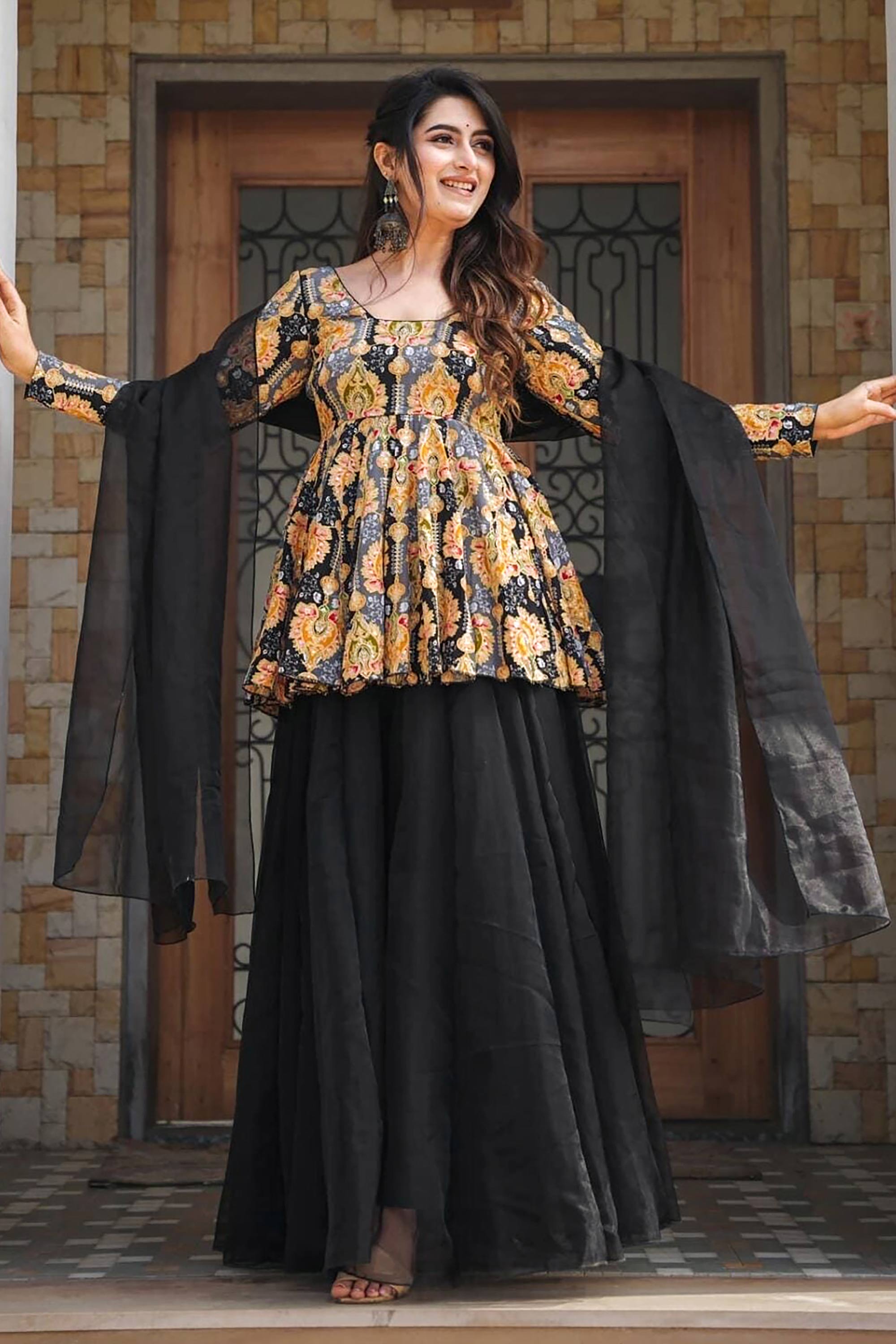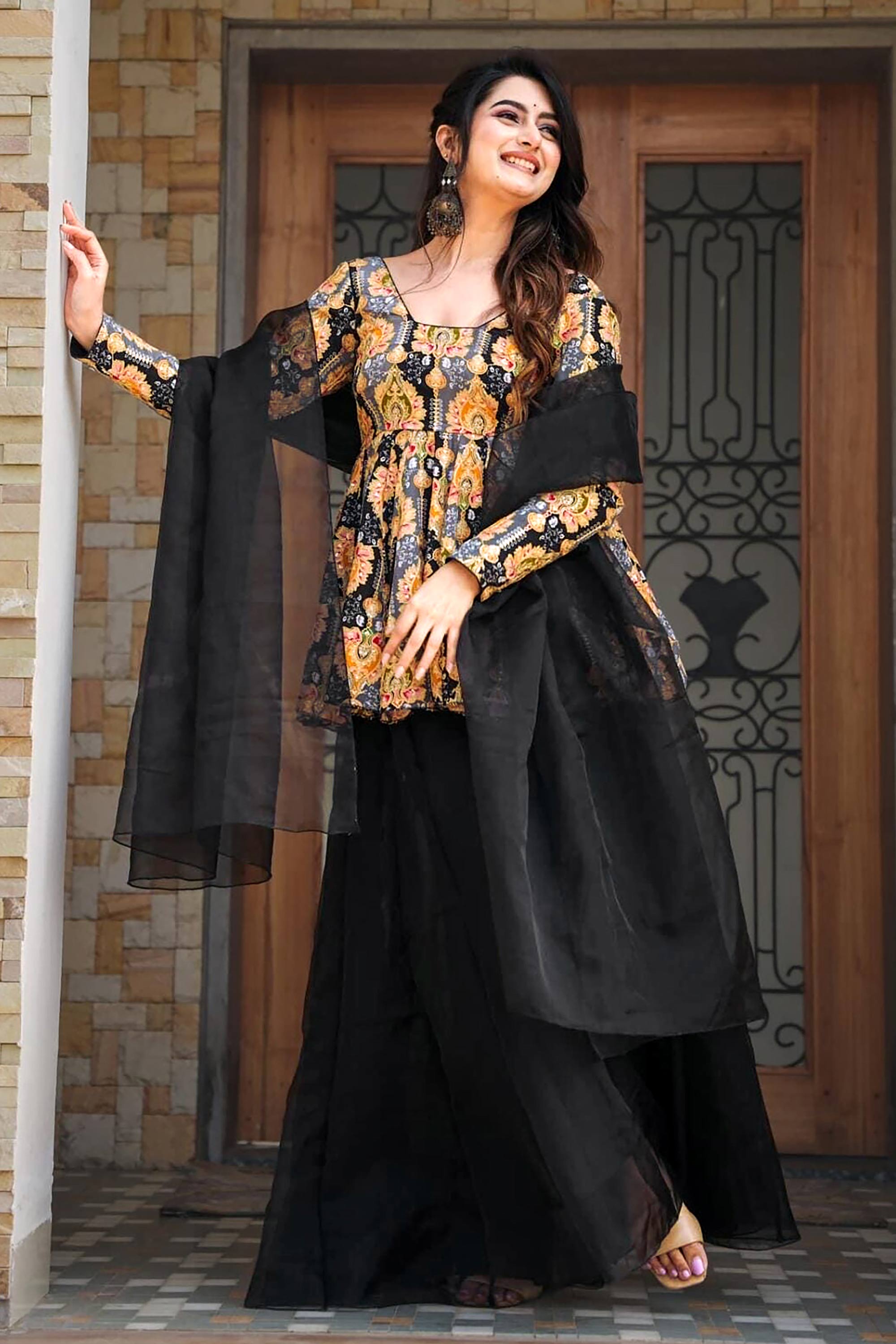 Art Silk Printed Black Readymade Palazzo Suit For Festive Wear