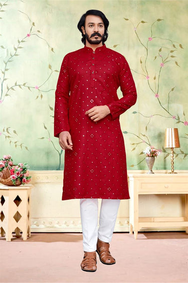 Art Silk Red Color Wedding Wear Readymade Designer Men Kurta Pyjama