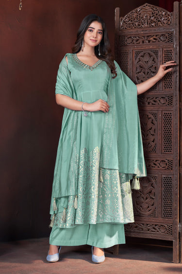 Art Silk Sea Green Color Foil Print Readymade Palazzo Salwar Suit