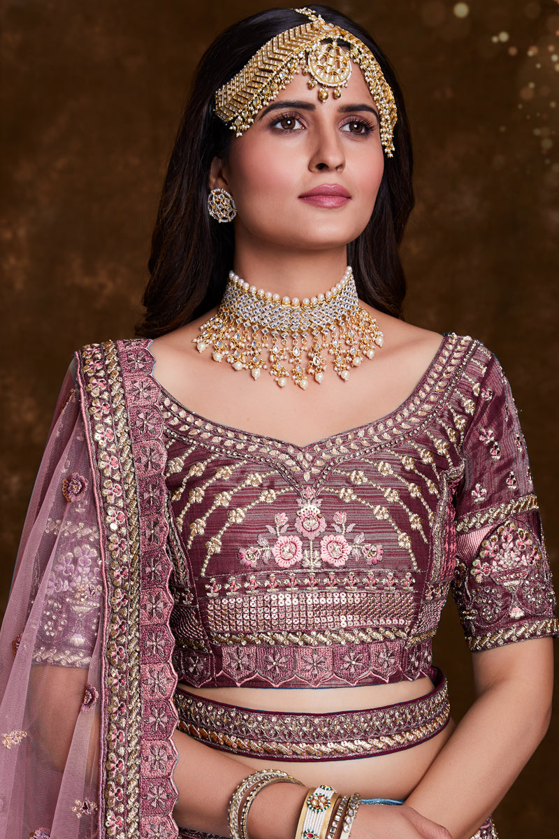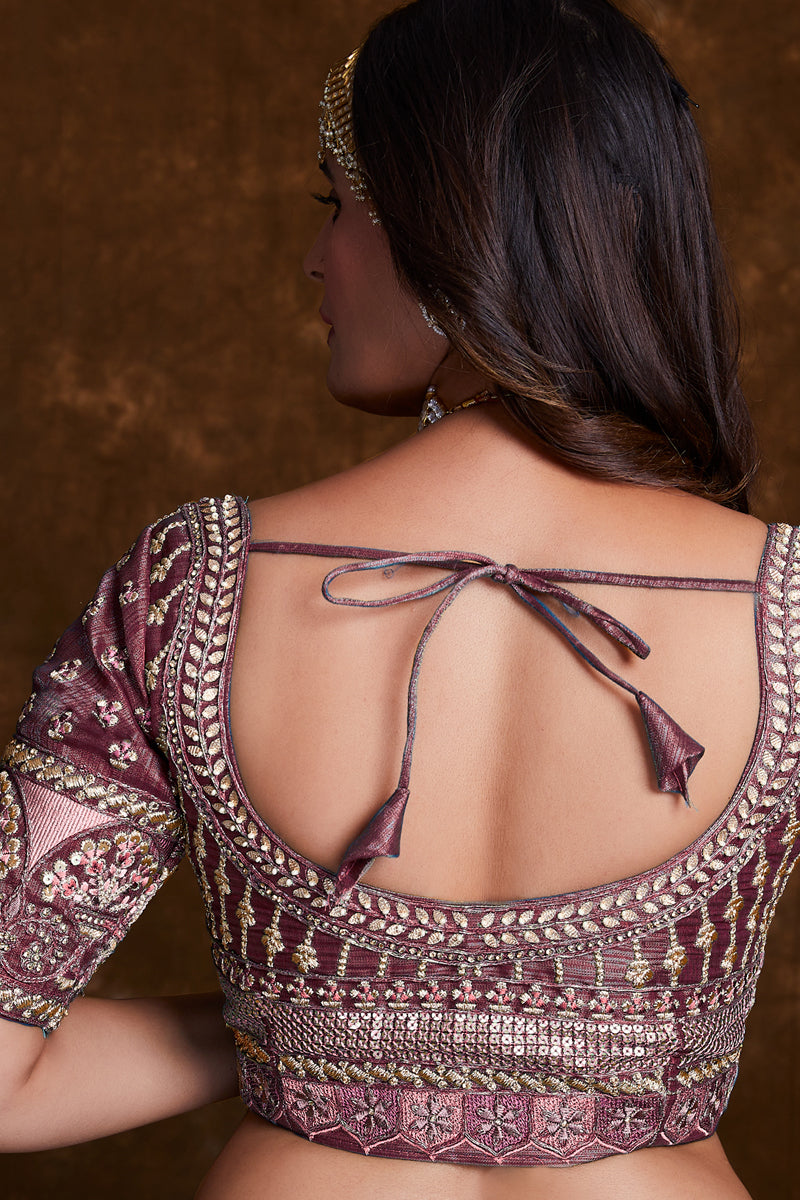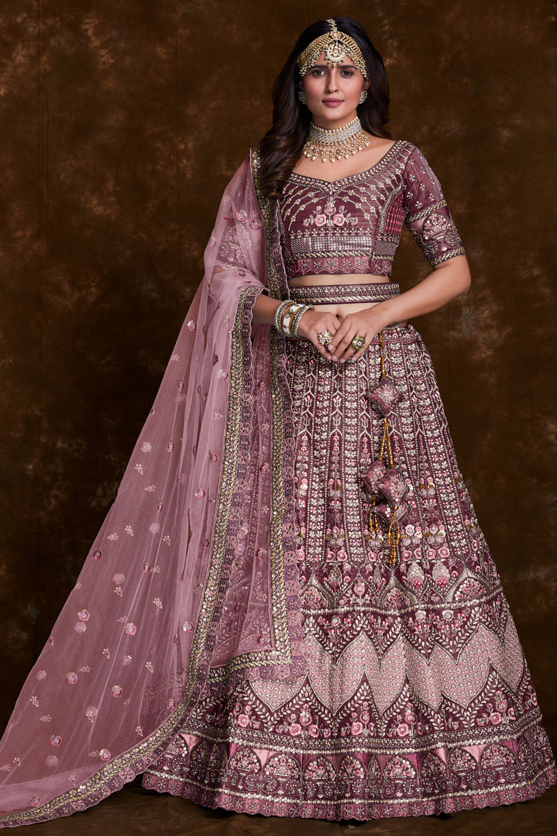 Art Silk Wine Sangeet Wear 3 Piece Embroidered Lehenga With Enigmatic Blouse