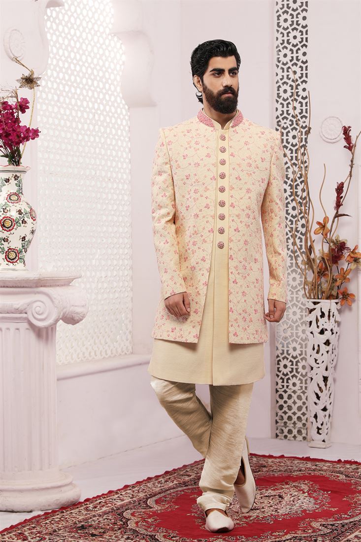 Attractive Beige Color Banarasi Silk Fabric Embroidered Work Wedding Function Readymade Designer Indo Western For Men