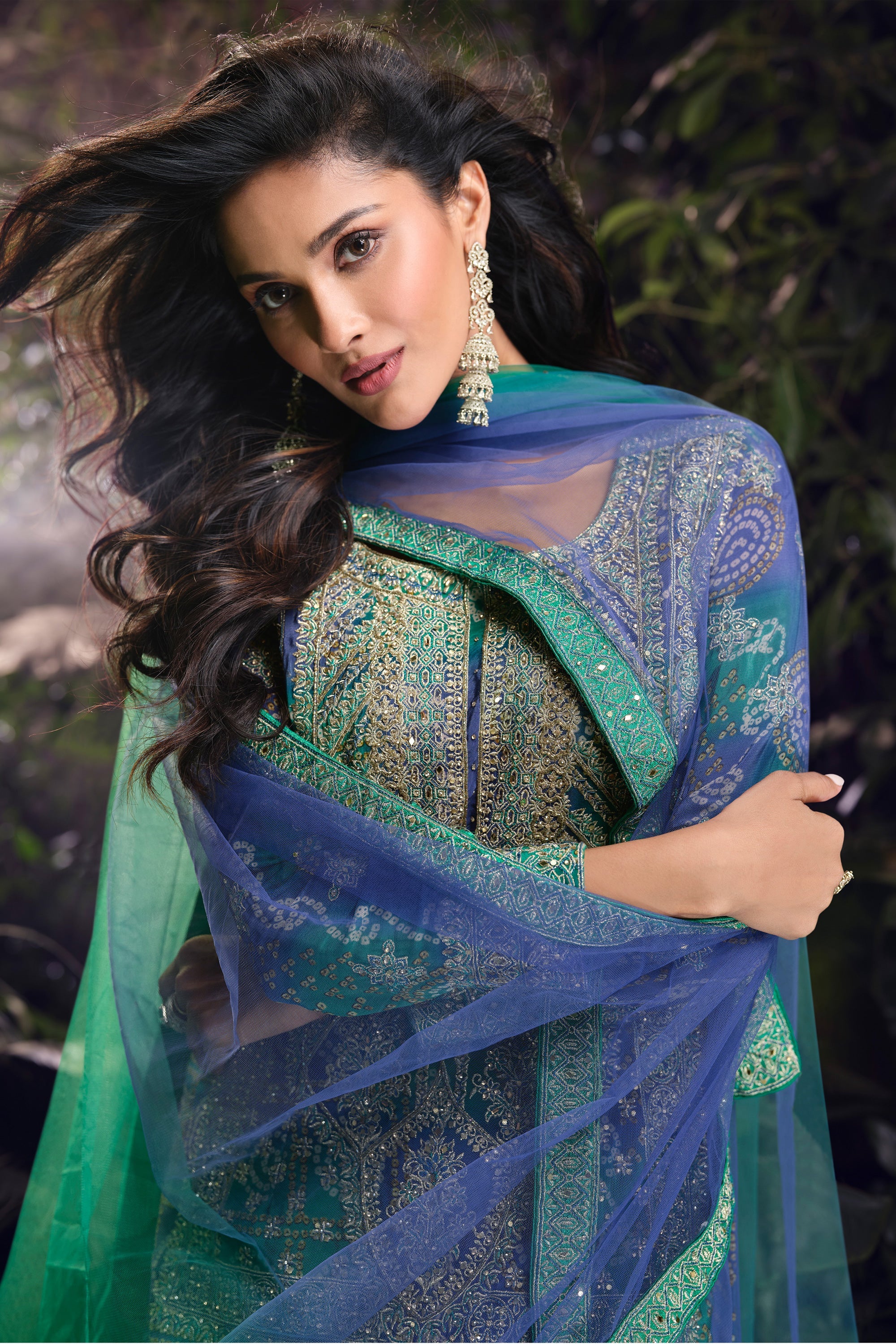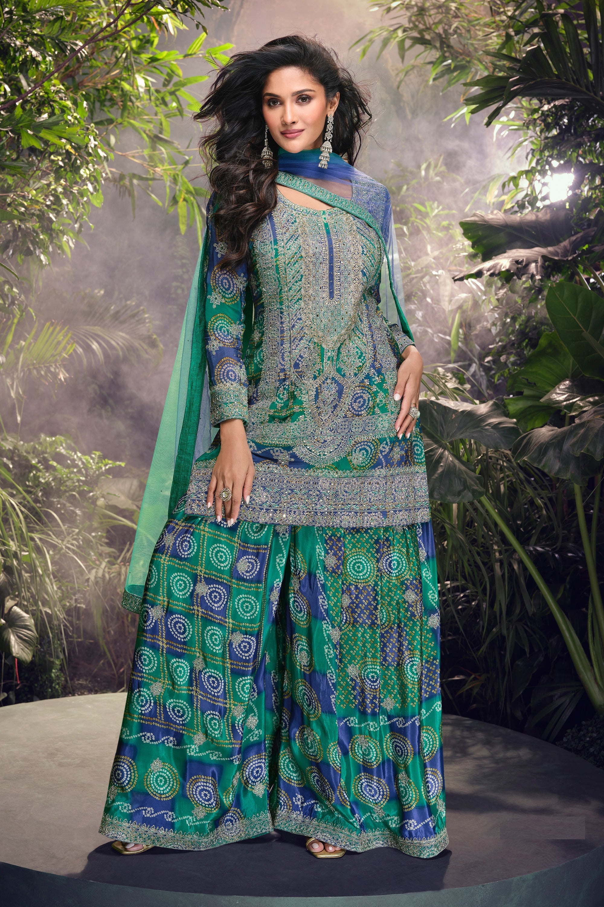 Attractive Cyan Chinon Embroidered Readymade Palazzo Suit