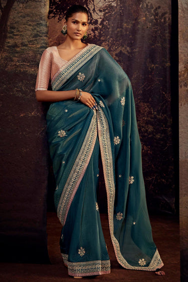 Attractive Fancy Work Teal Color Art Silk Fabric Saree