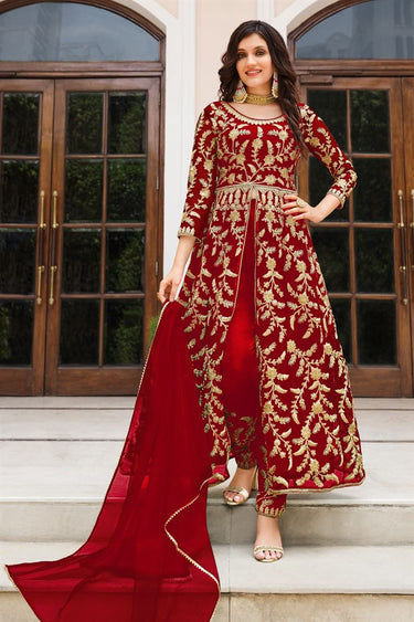 Awesome Net Fabric Embroidered Salwar Suit In Red Color