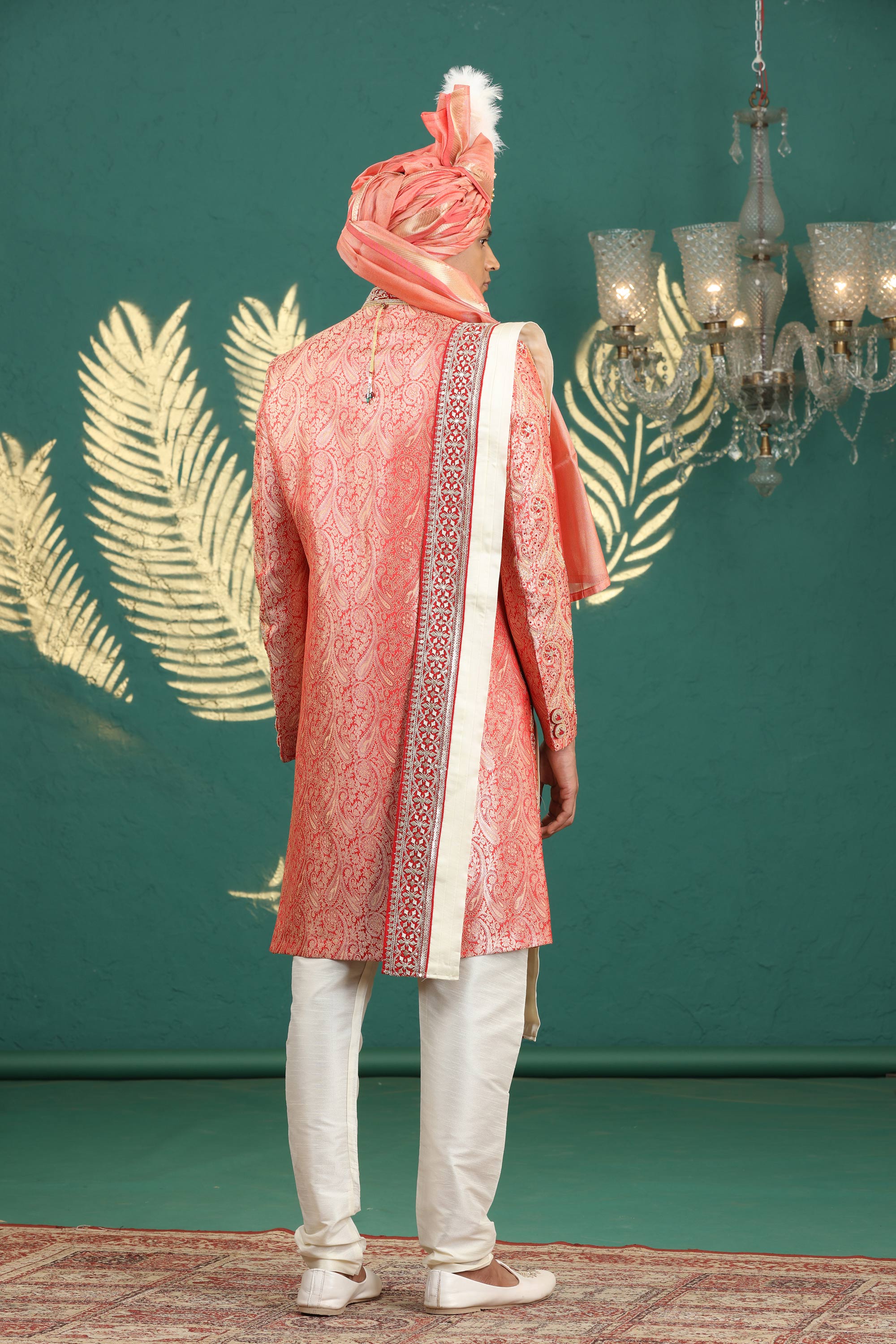 A striking choice for your wedding day, this maroon sherwani boasts intricate gold patterns that enhance its luxurious appeal. Tailored for ease of wear, the outfit fits comfortably and stands out at any special occasion. The coordinating bottoms provide a polished and cohesive appearance. With its vibrant tone and superior craftsmanship, this sherwani makes an impressive addition to your formal wardrobe. Celebrate love and tradition with this stunning ensemble.