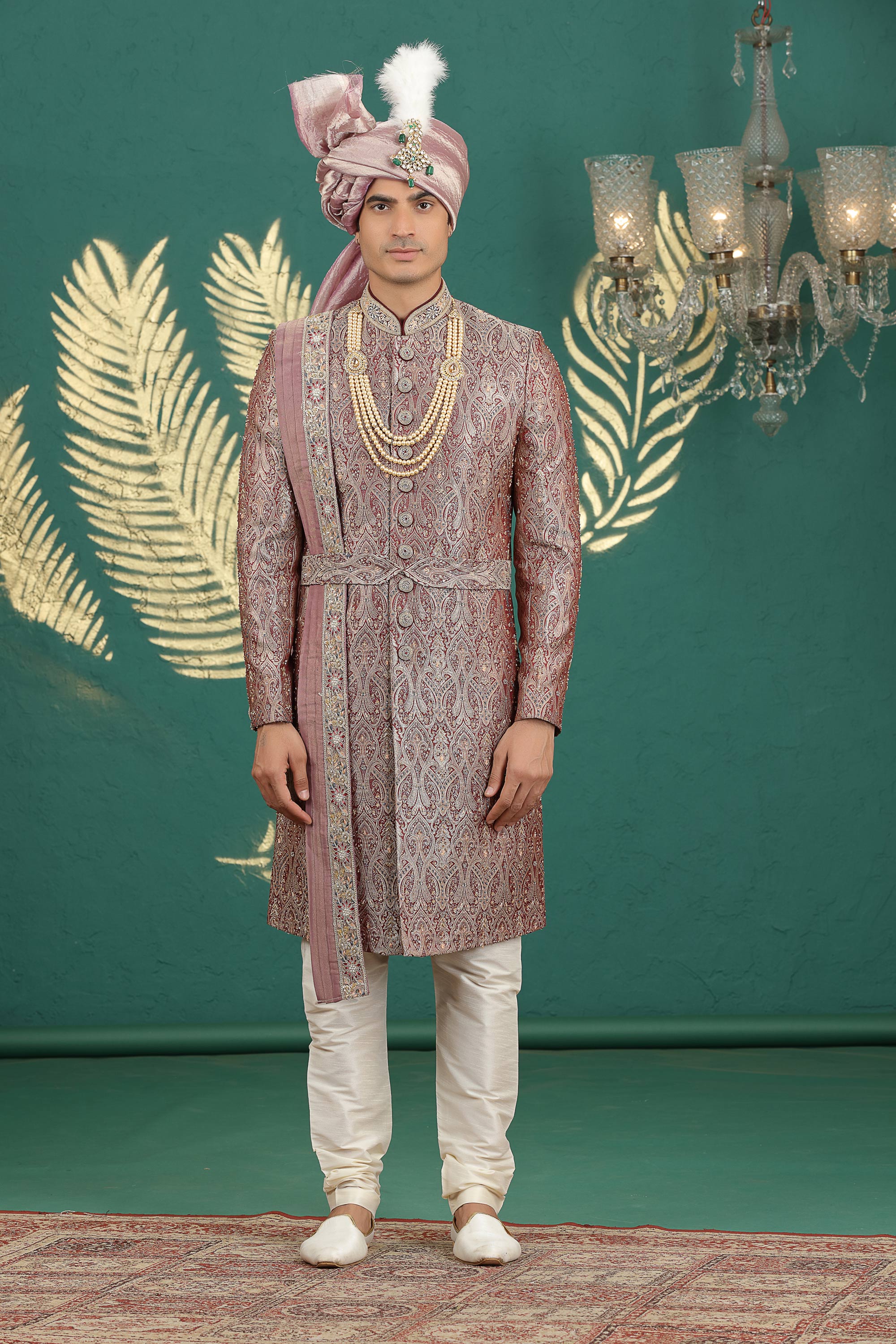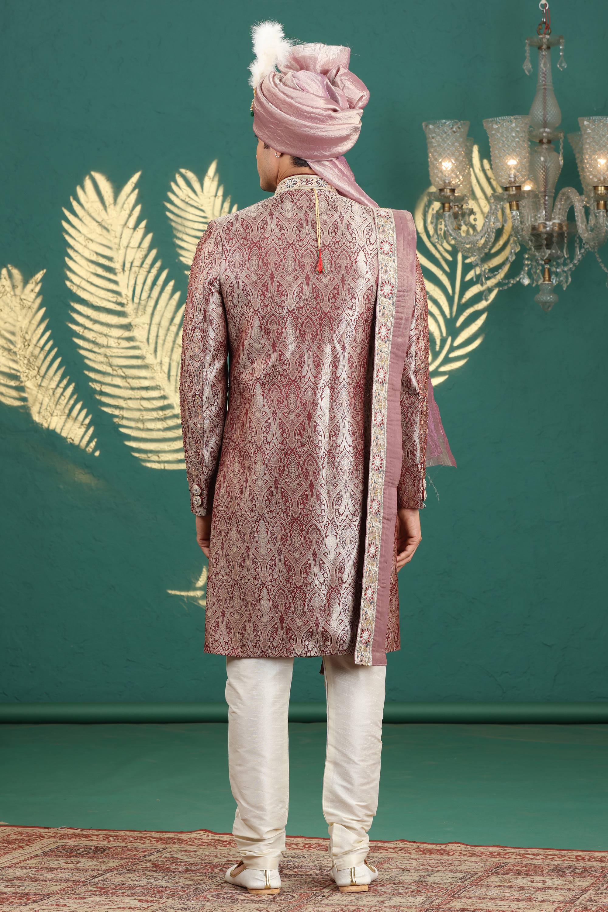 Banarasi Jacquard Wine Wedding Wear Readymade Designer Men Sherwani With Stole