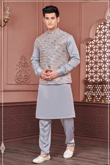 Banarasi Silk Grey Color Wedding Wear Embroidery Work Readymade Designer Men Kurta Pyjama With Jacket