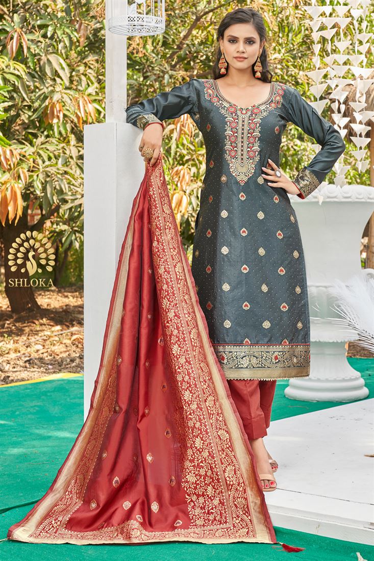 Banarasi Silk Salwar Suit with Grey Color Weaving Work