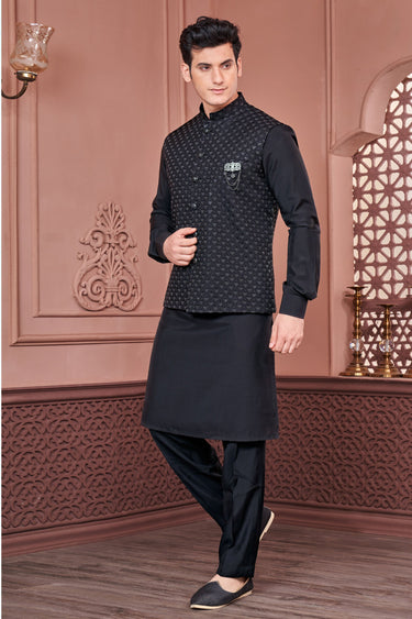 Banarasi Silk Stunning Embroidery Work Black Color Function Wear Readymade Men Kurta Pyjama With Jacket